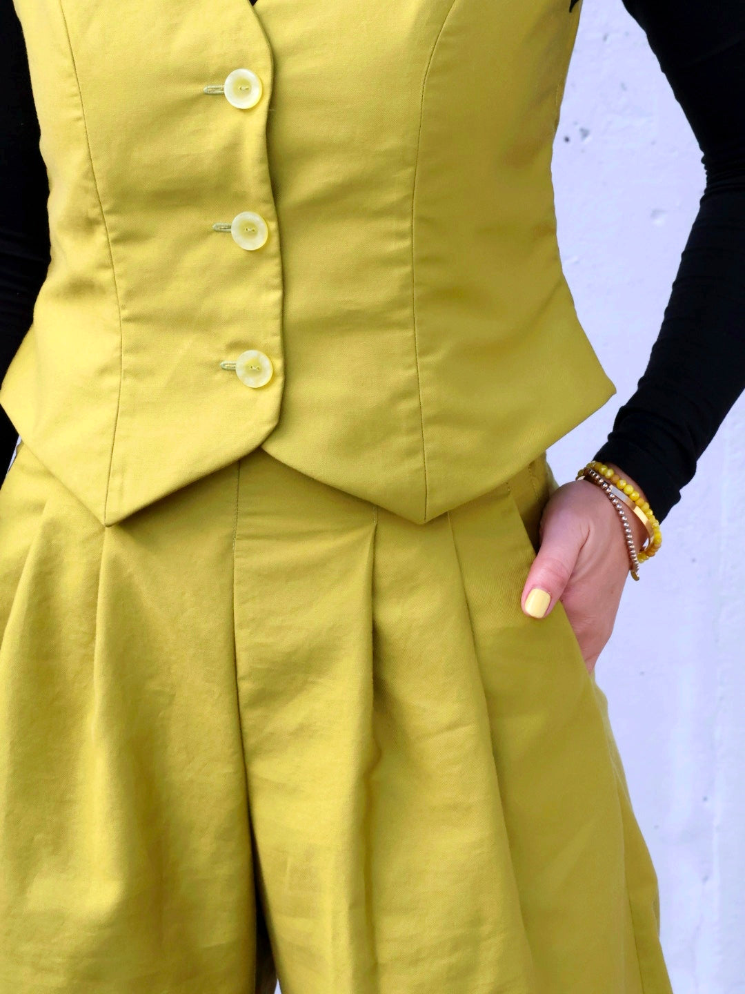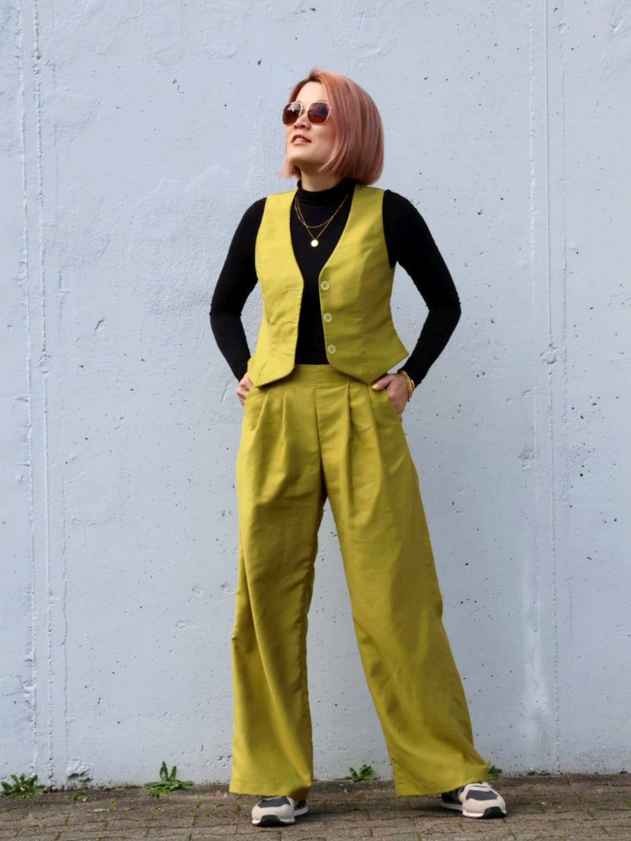 Gelbesglück hat sich einen knalligen Zweiteiler bestehend aus der Hose 'Frau Miko' von Studioschnittreif und der Weste 'Noelle' von Kibadoo geschneidert und läutet mit diesem fröhlich, frischen Outfit den Frühling ein!