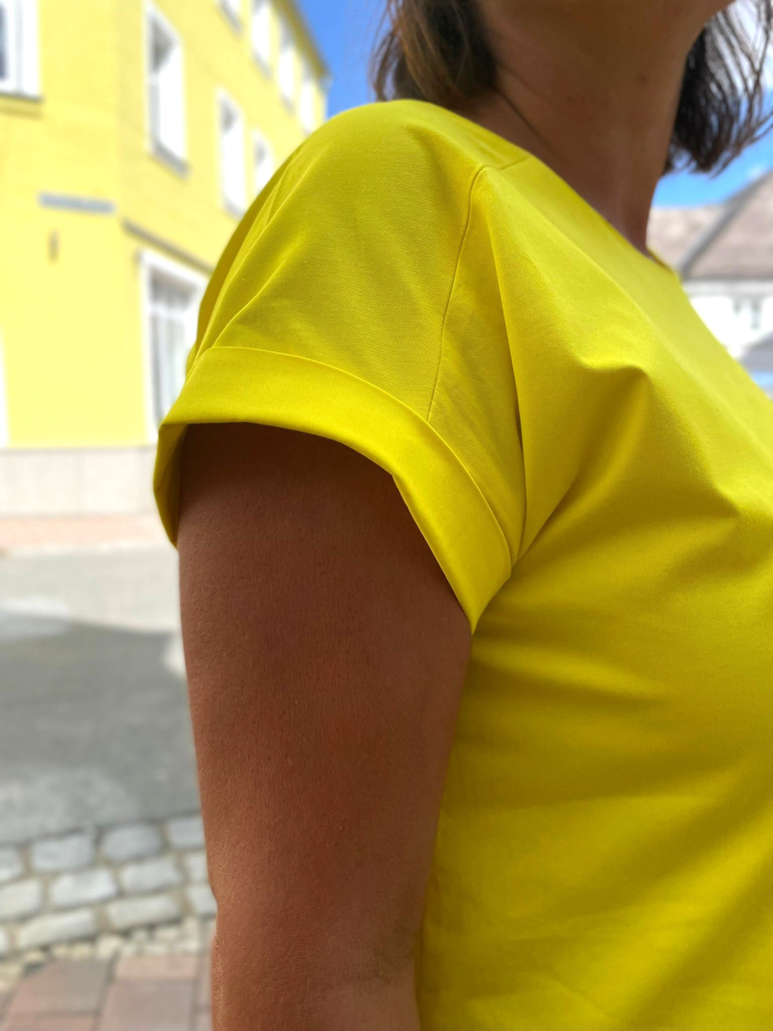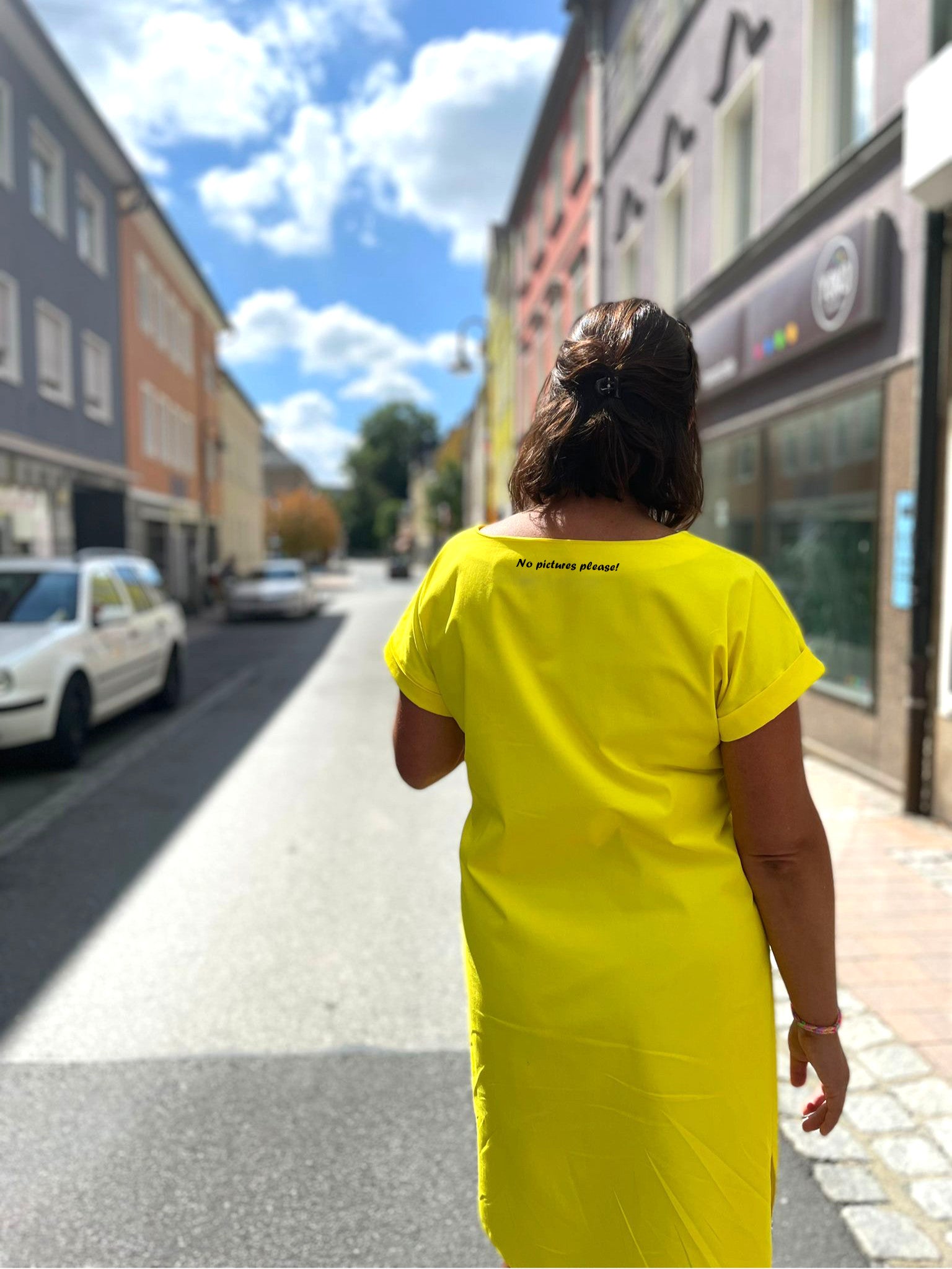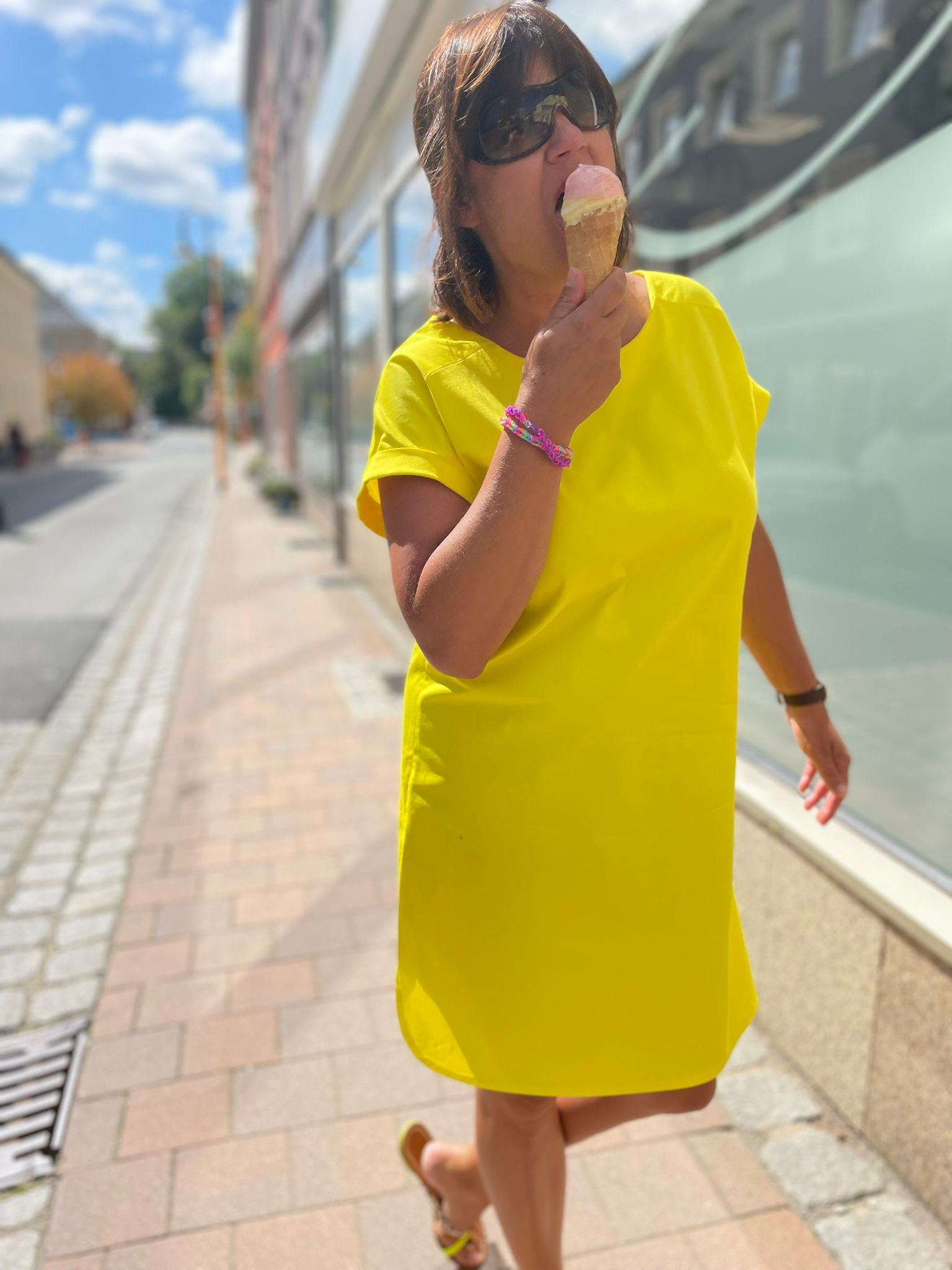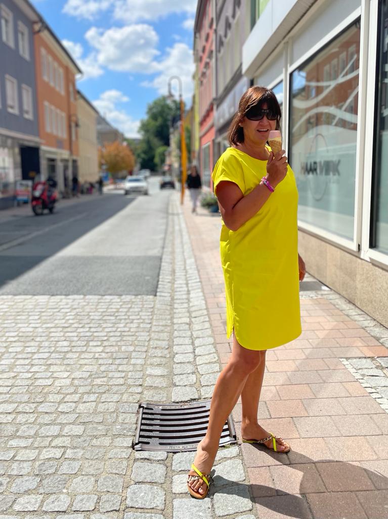 Ihr habt Steffi im Urlaub so angefixt, dass sie sich Zuhause sofort an die Nähmaschine gesetzt und sich aus unserem Cotton Stretch Chino in knalligem YELLOW ihr Lieblingssommerkleid #sommerbluse von @lenipepunkt genäht hat. Das Kleid zieht definitiv alle Blicke auf sich und passt perfekt zum sonnigen Sommer🌞