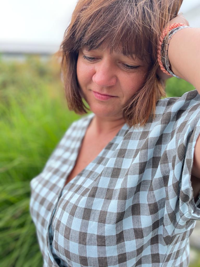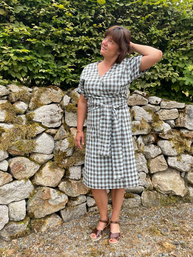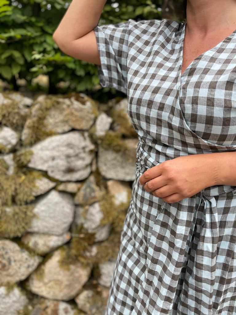 Steffis burda-Wickelkleid 6664 könnte nicht schöner sein! Unser Ginghamkaro in Oliv/Türkis ist wie dafür gemacht.