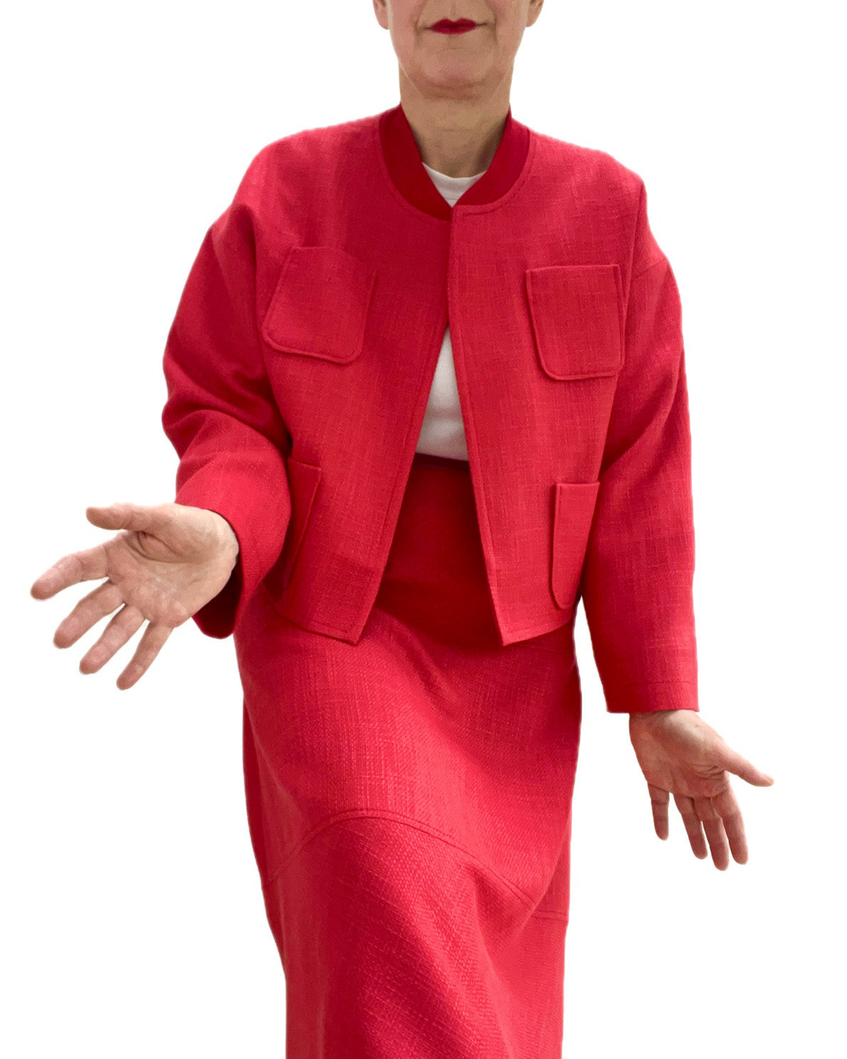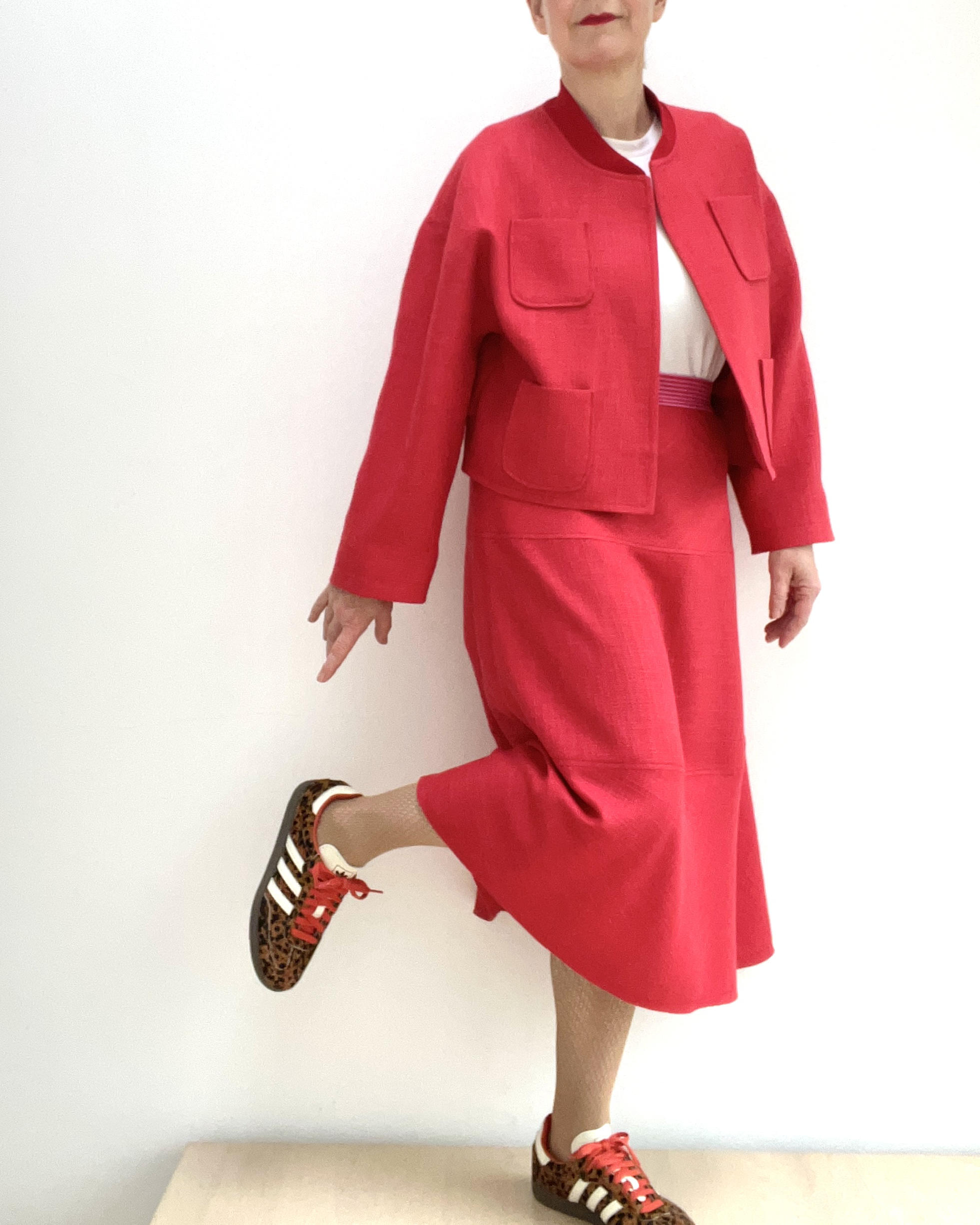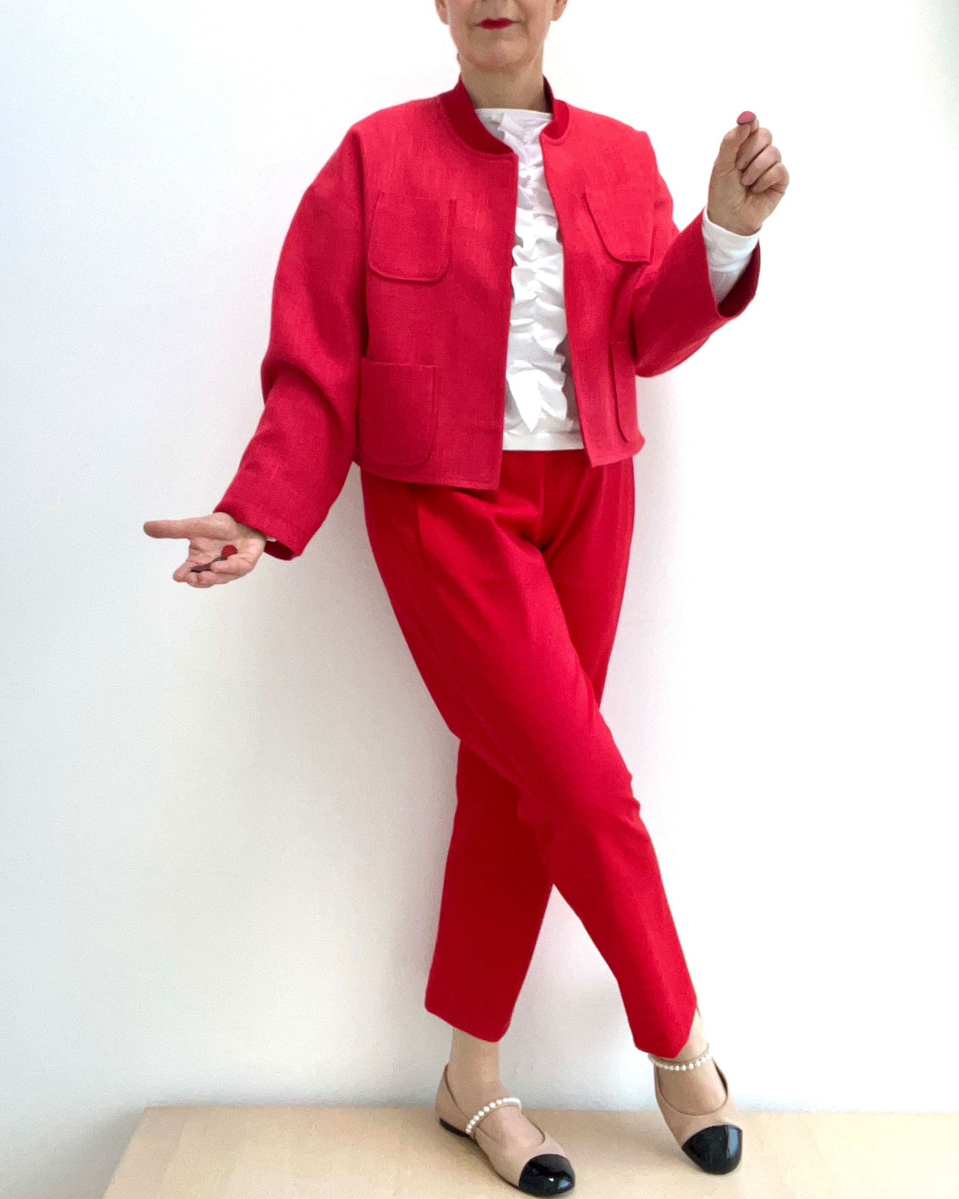 Unasewing2021 hat sich aus dem feinen Chanel in der Farbe Korall ein tolles Outfit geschneidert. Sie kombiniert ihre Jacke "Judith" von Fibremood einmal mit einer Hose und einmal mit dem Sleekwich-Rock von Frau Marzi.