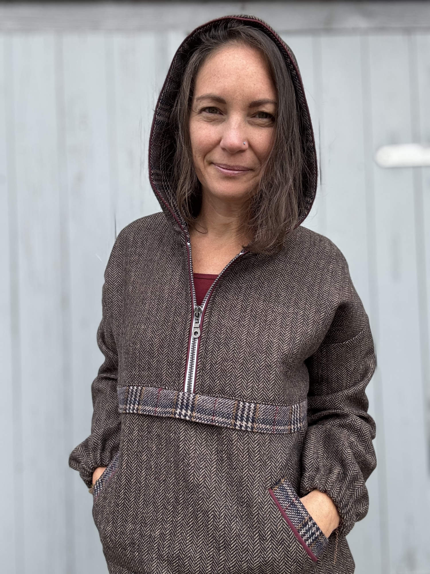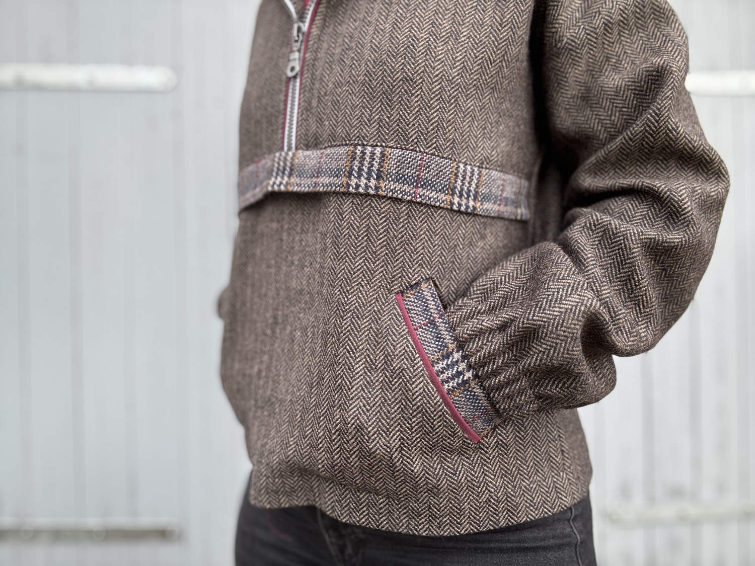 Der lässige Hoodie ist für unsere Webware entstanden und das Glencheck Erich wurde kombiniert mit dem Fischgrat Goldmarie. Das Schnittmuster gibt es leider noch nicht. Es wird aber so schnell wie möglich bei Katjuschka erscheinen und wir halten euch hier auf dem Laufenden!
