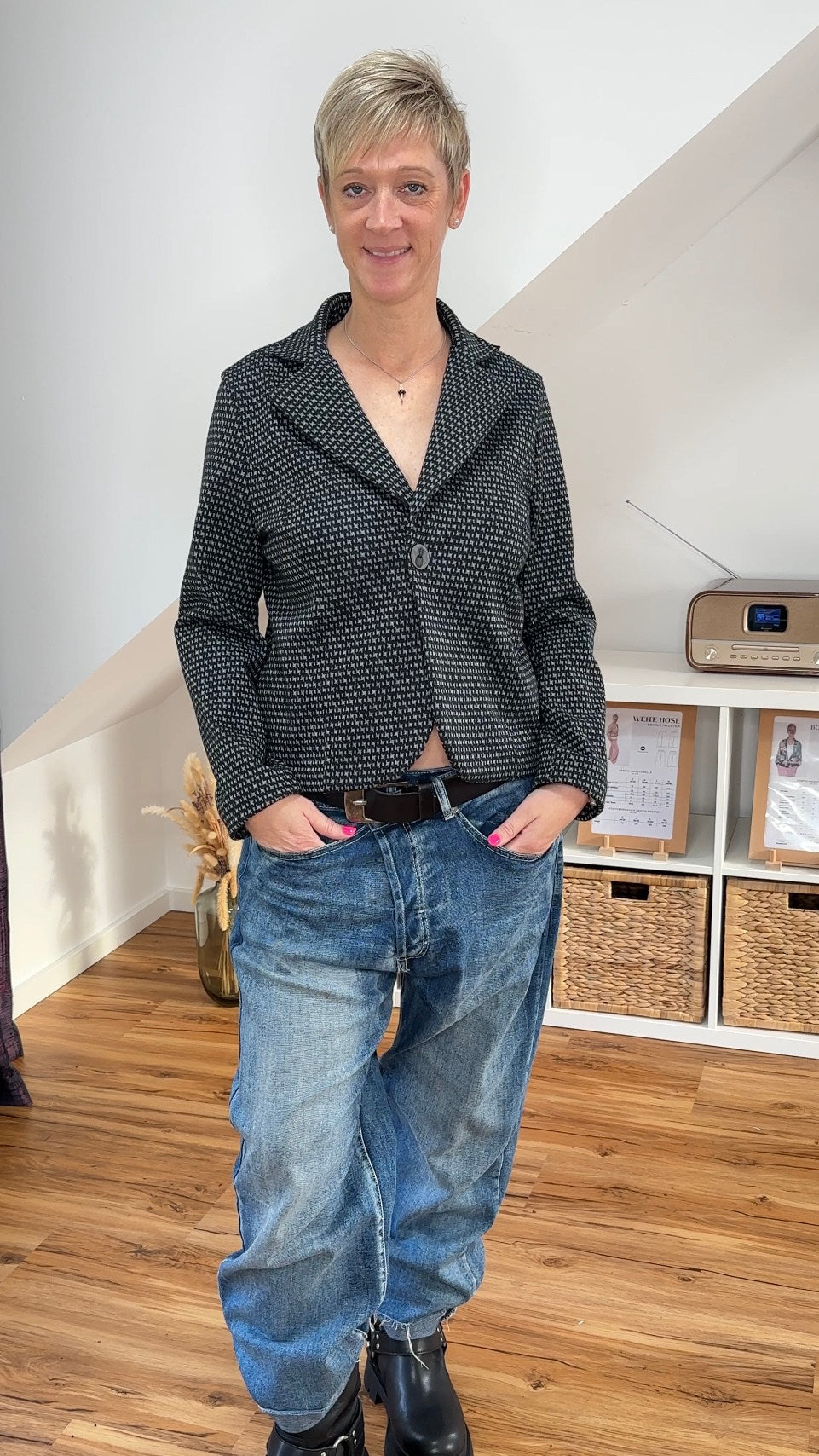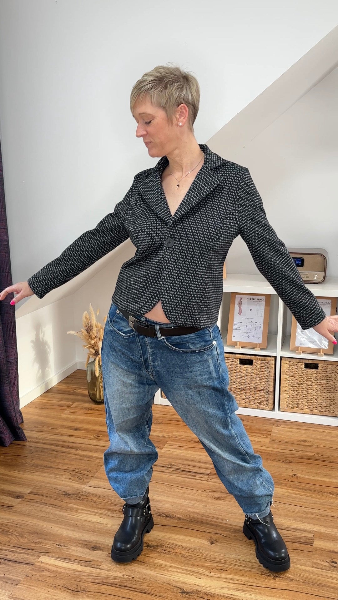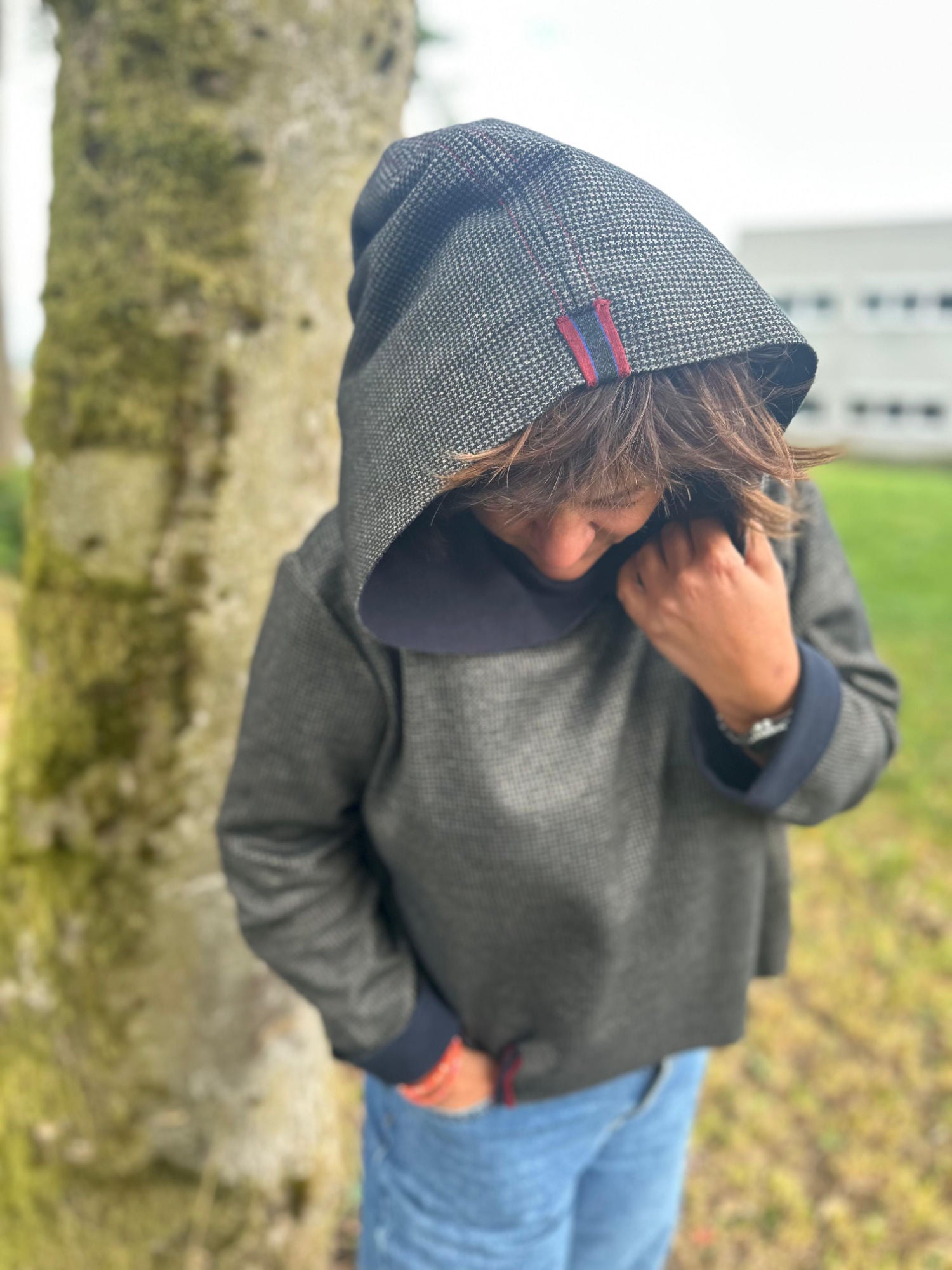 Das trendige große Hahnentrittmuster in Grau/Schwarz auf der einen Seite und eine dezente dunkelblaue Uniseite lassen sich super und easy kombinieren und sorgen dafür, dass deine DIY-Fashion sowohl von innen als auch von außen einen coolen Look erzeugt!