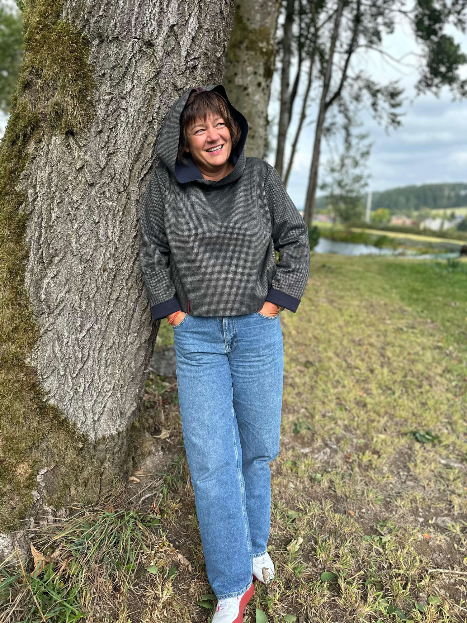Steffi hat sich aus dem flexiblen Strick in Doubleface-Optik mit leicht strukturierter Oberfläche den lässigen Hoodie "Pull & Over" von @machbarsbesteschnitte aus dem Pepitamuster in der Farbe "Gold" genäht, der sie bei Wind und Wetter warm hält! Ein superschnelles Projekt und aus diesem Allrounder perfekt für die derzeitigen Temperaturen!
