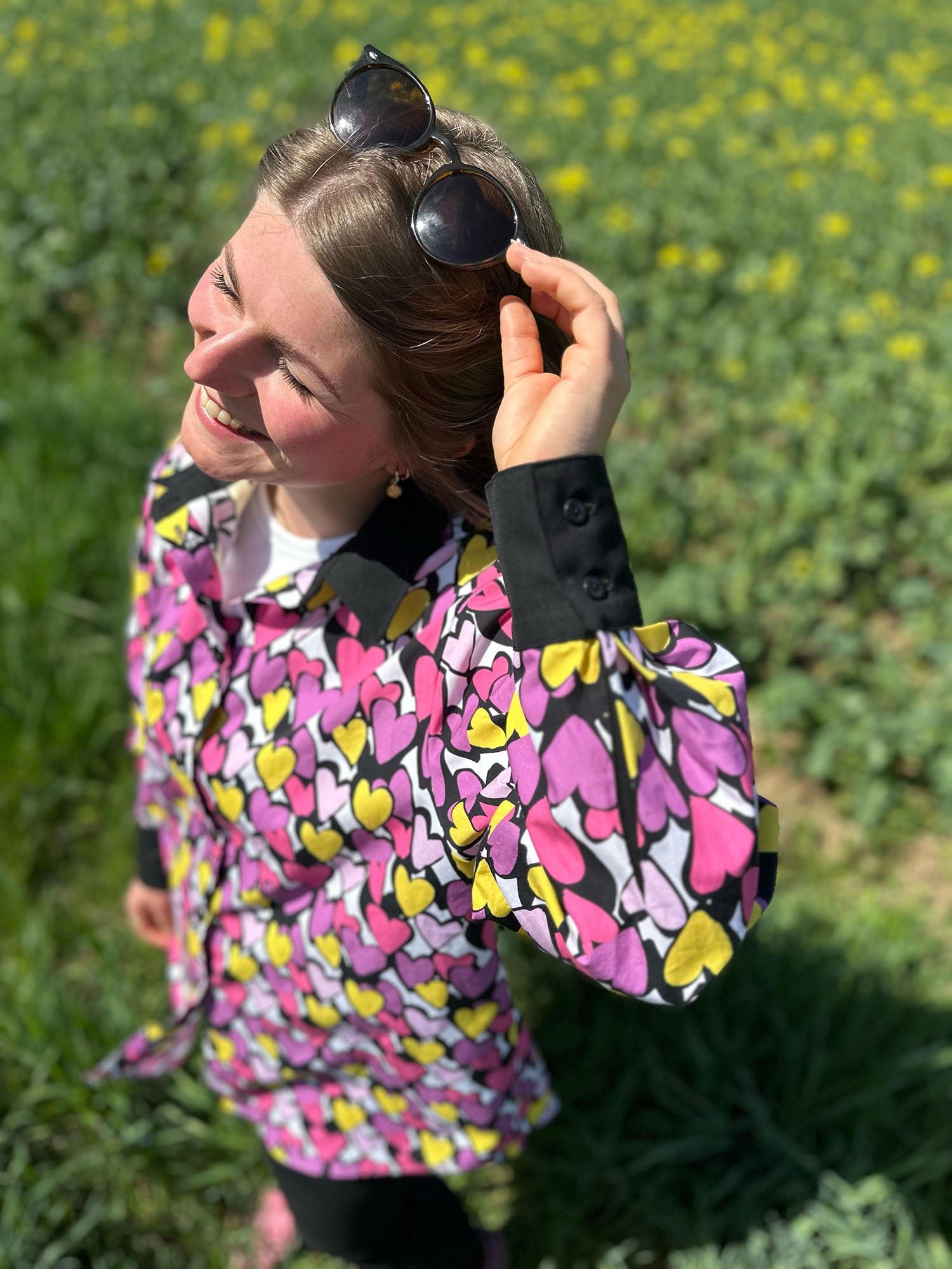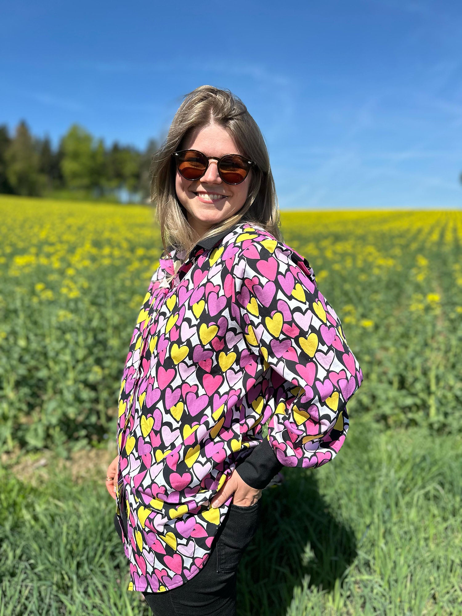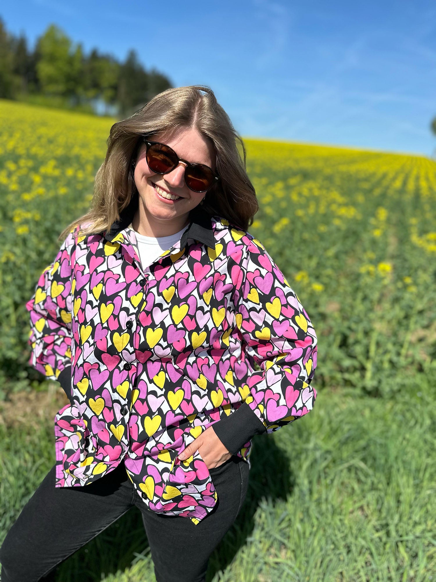 Ines hat sich gleich in die pinken Herzchen verguckt und sich daraus die klassische Oversize Bluse Olivia von bara-studio genäht und nun überlegt sie, ob es vielleicht doch ihr Muttertagsgeschenk an die liebe Mama wird.