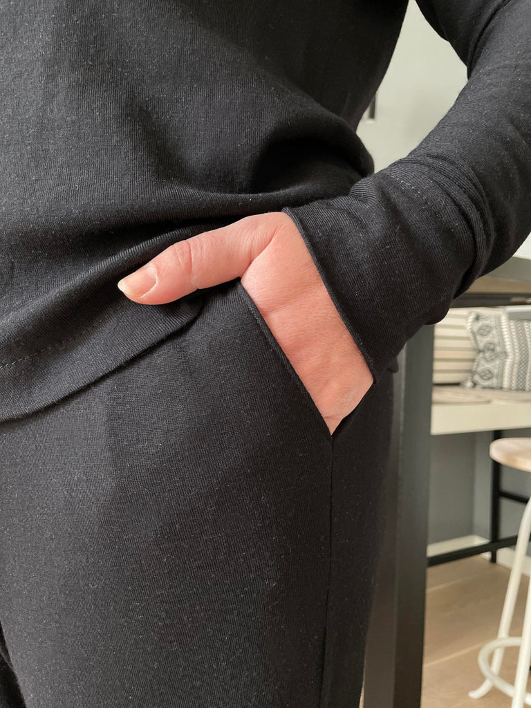 Steffi hat sich aus diesem fließenden Traum in 'BLACK' eine stylische Version von der Palazzohose "Peter" von sewingmachina gezaubert und den lässig schicken Pulli Pony von Schnittmuster Berlin dazu kombiniert.