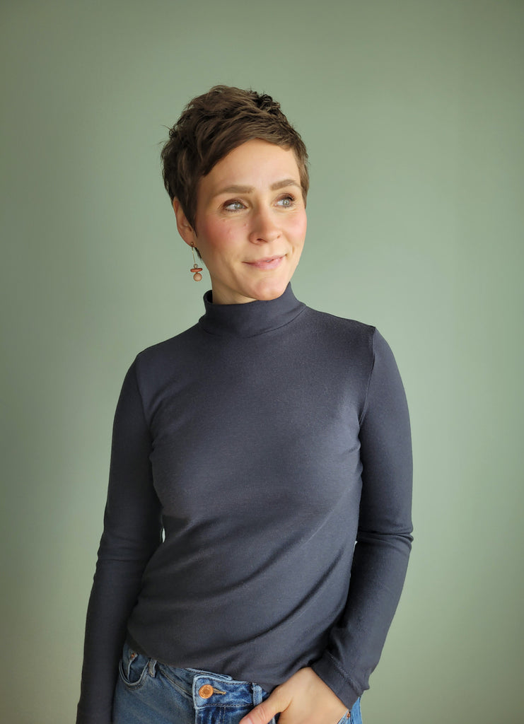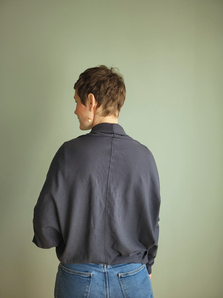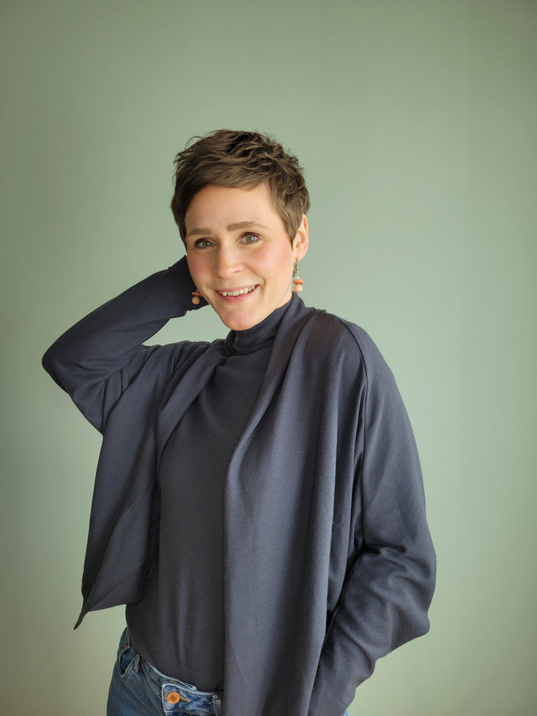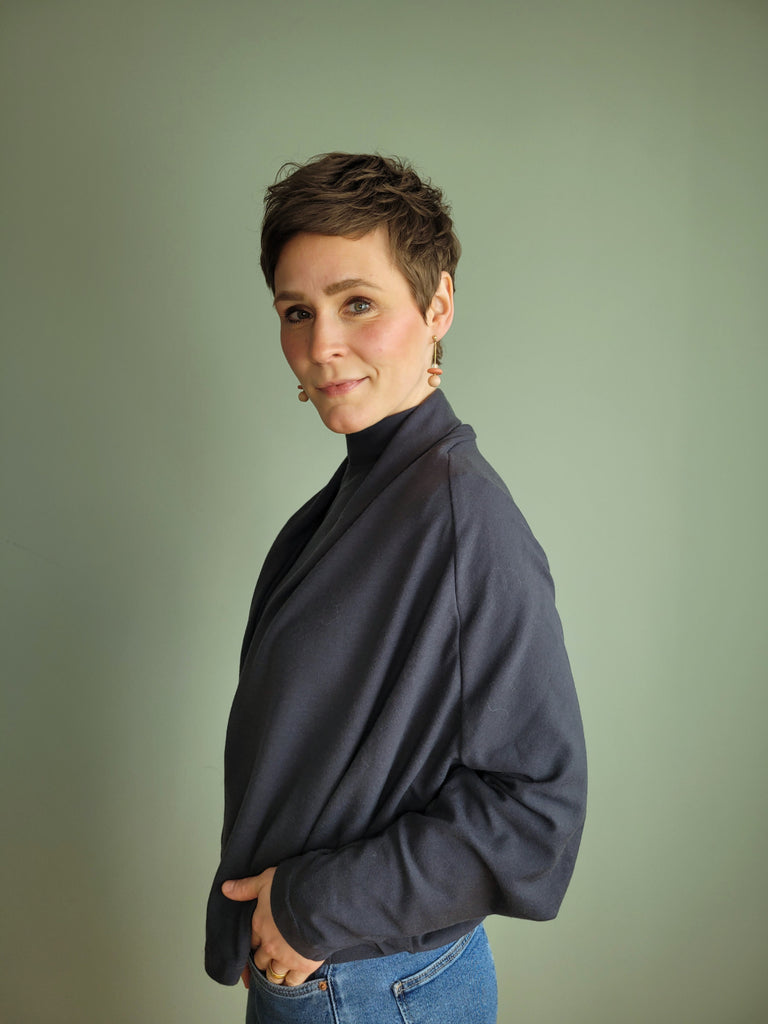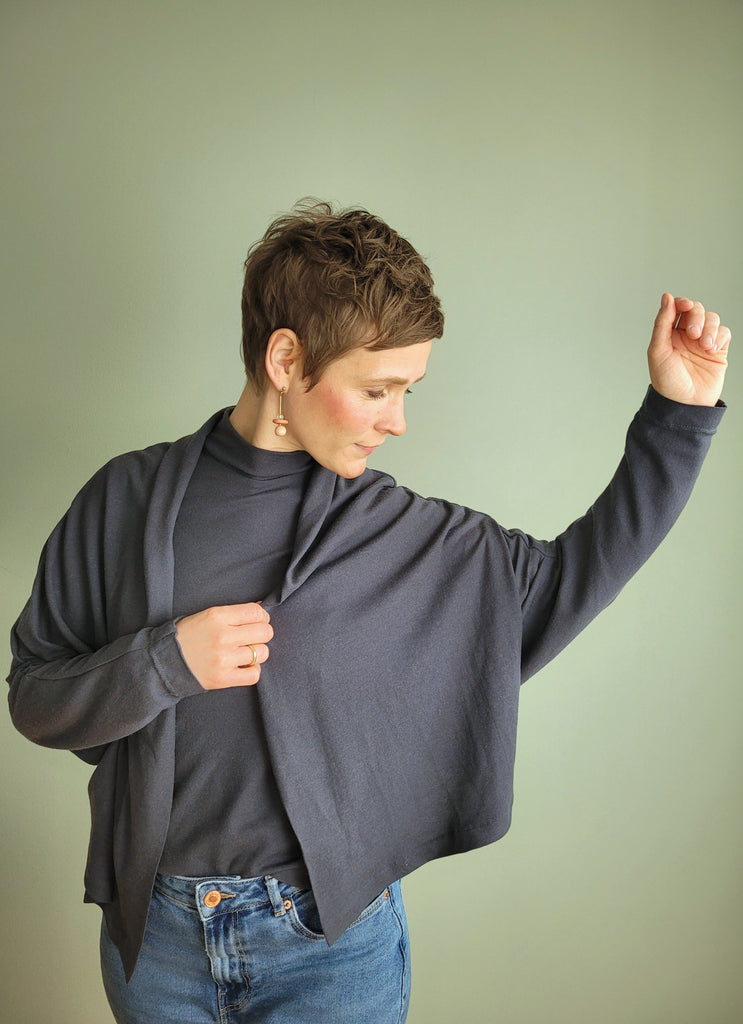 adinskausminsk hat ein wandelbares Twinset in der Farbe 'OBSIDIAN' genäht! Das Shirt ist das 'Nikko Top' von Truebias und ihr Jäckchen ist das 'Palermo Knit Jacket' von Style Arc. Die zwei Schnitte passen super zusammen und ergeben in Kombination mit unserem Merinojersey einen sportlich legeren Style.