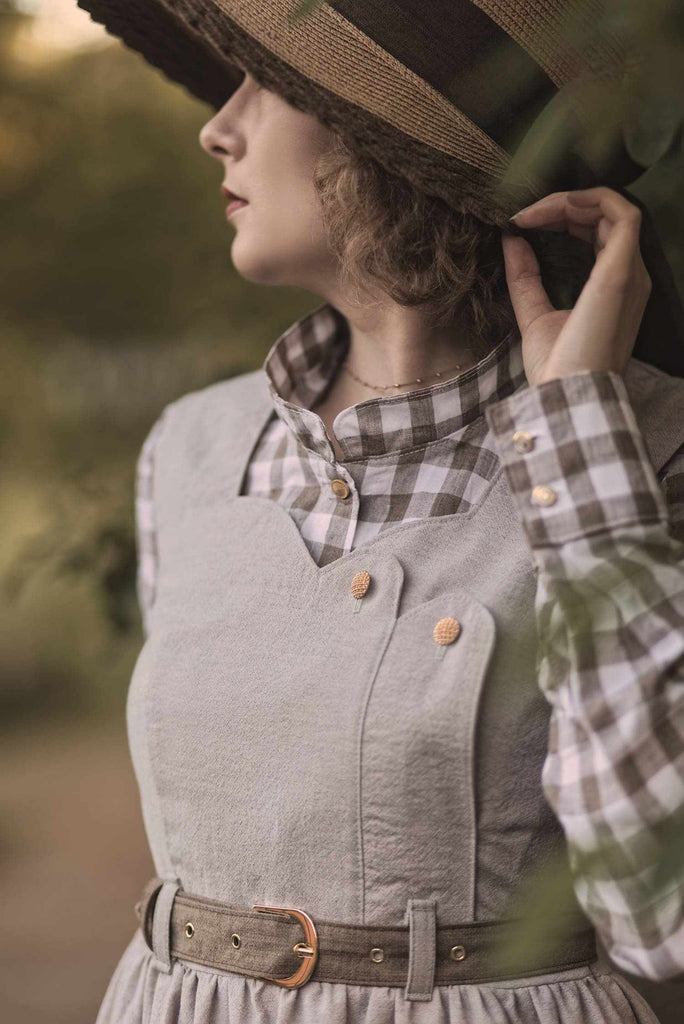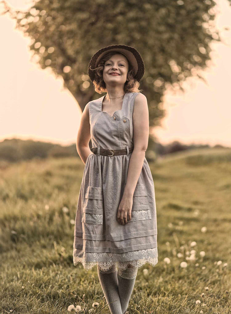 Vogelnaht hat aus unserer Washwool in der Farbe CASHMERE ROSE ein zauberhaftes Kleid im Vintagestyle genäht! Ausgeschmückt mit feiner Spitze am Saum und verspielten Details wie dem Herzausschnitt und den aufgesetzten Taschen, ist dieses Kleid ein absoluter Hingucker und definitiv kein 0815-Teil von der Stange! Sie kombiniert ihr Kleid mit einer klassischen, taillierten Bluse aus unserem Ginghamkaro mit Stehkragen und breiten Manschetten! Ihren Gürtel hat sie ebenfalls aus unserer Washwool genäht und zwar in der Farbe GRANATAPFEL.