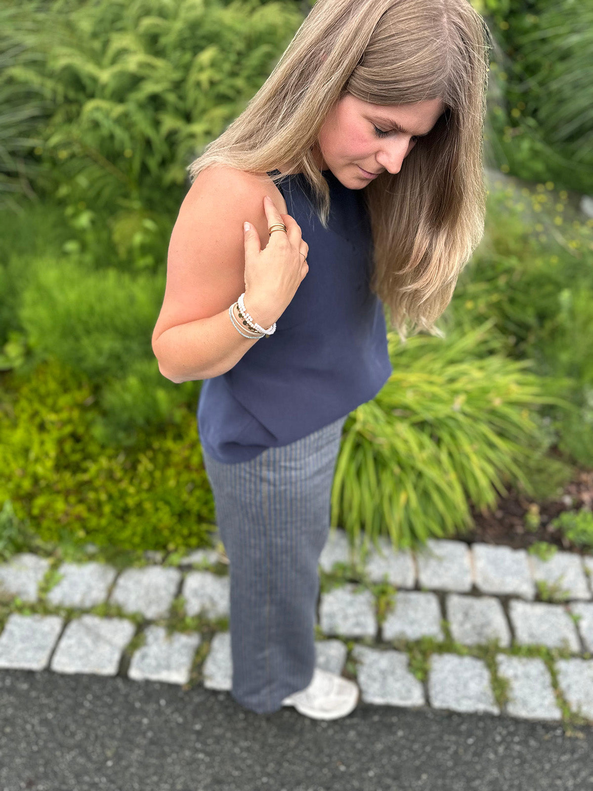 Ines hat sich den feinen Wolle-Leinen-Streifen in der Farbevariante Blau/Beige zu ihrer Lieblings-Ruck-Zuck-Hose, der 'Almost Long Trousers' von The Assembly Line geschneidert!