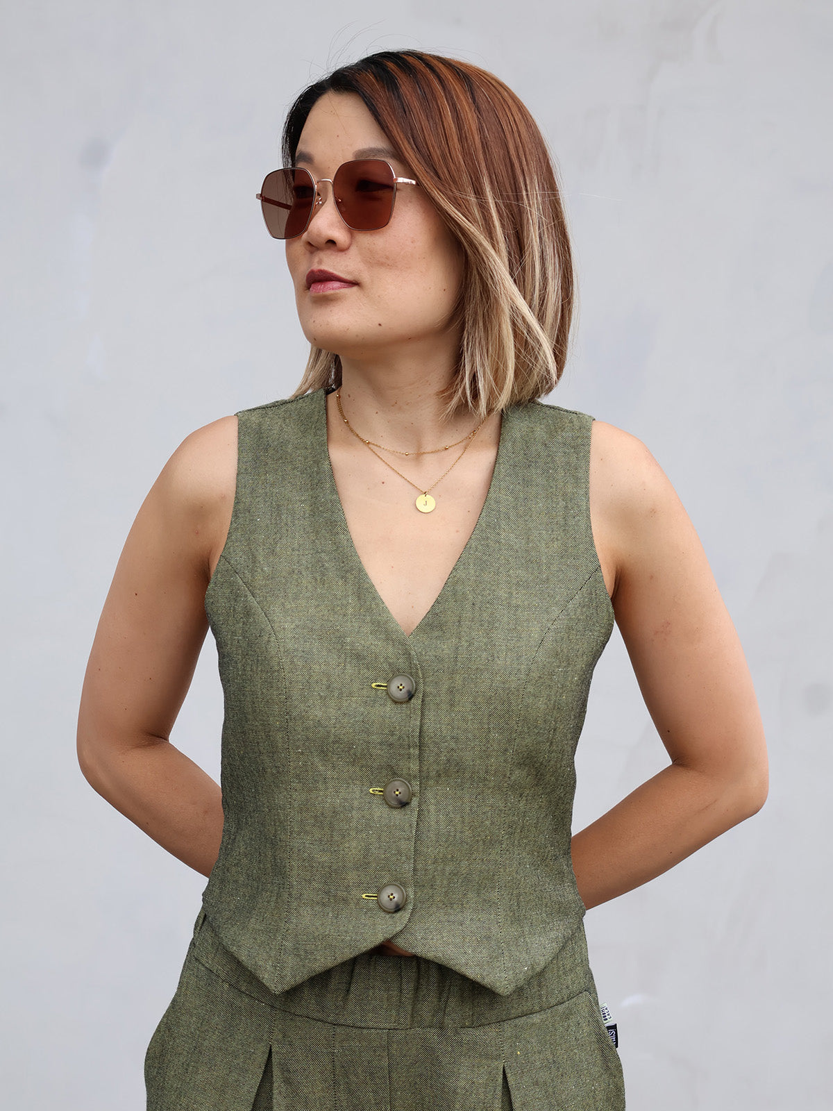 Verwendet hat sie die Schnitte 'Freja' von Fibremood, die Weste 'Noelle' von Kibadoo und die Bluse 'Strik' von Krullenbol.