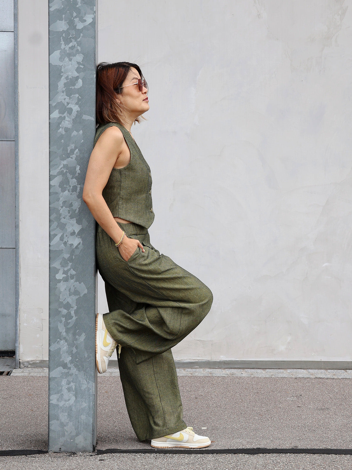 Jasmin von Gelbes_Glück hat sich ein wunderschönes Outfit aus unserem Wolle-Leinen-Mix in der Gelb/Grau-Variante gezaubert und liebt ihre neuen Modepieces. Sie kombiniert den Streifen in Gelb/Grau als Bluse mit dem Uni in Gelb als weite Hose und Weste! ☀️