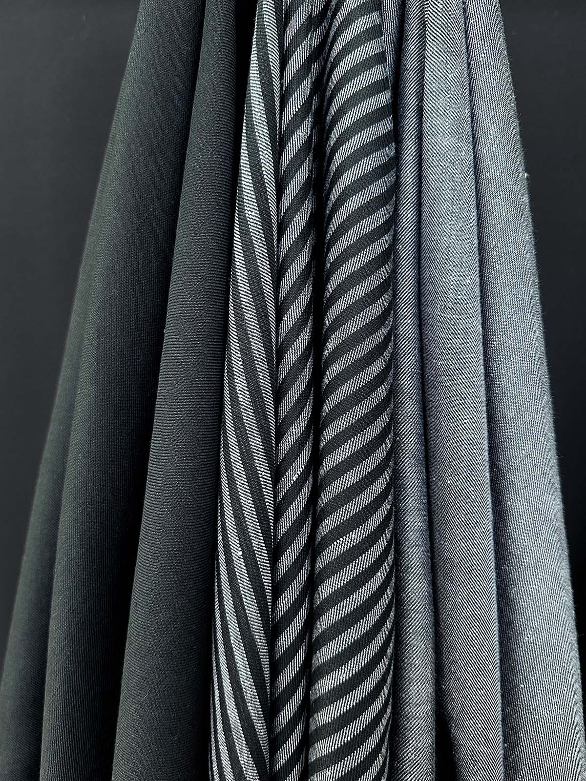 Dieser Wolle-Leinen-Mix kommt als Uni in kühlem Grau zu dir unter die Nähmaschine und lässt sich wundervoll kombinieren mit dem Streifen in Schwarz/Grau!