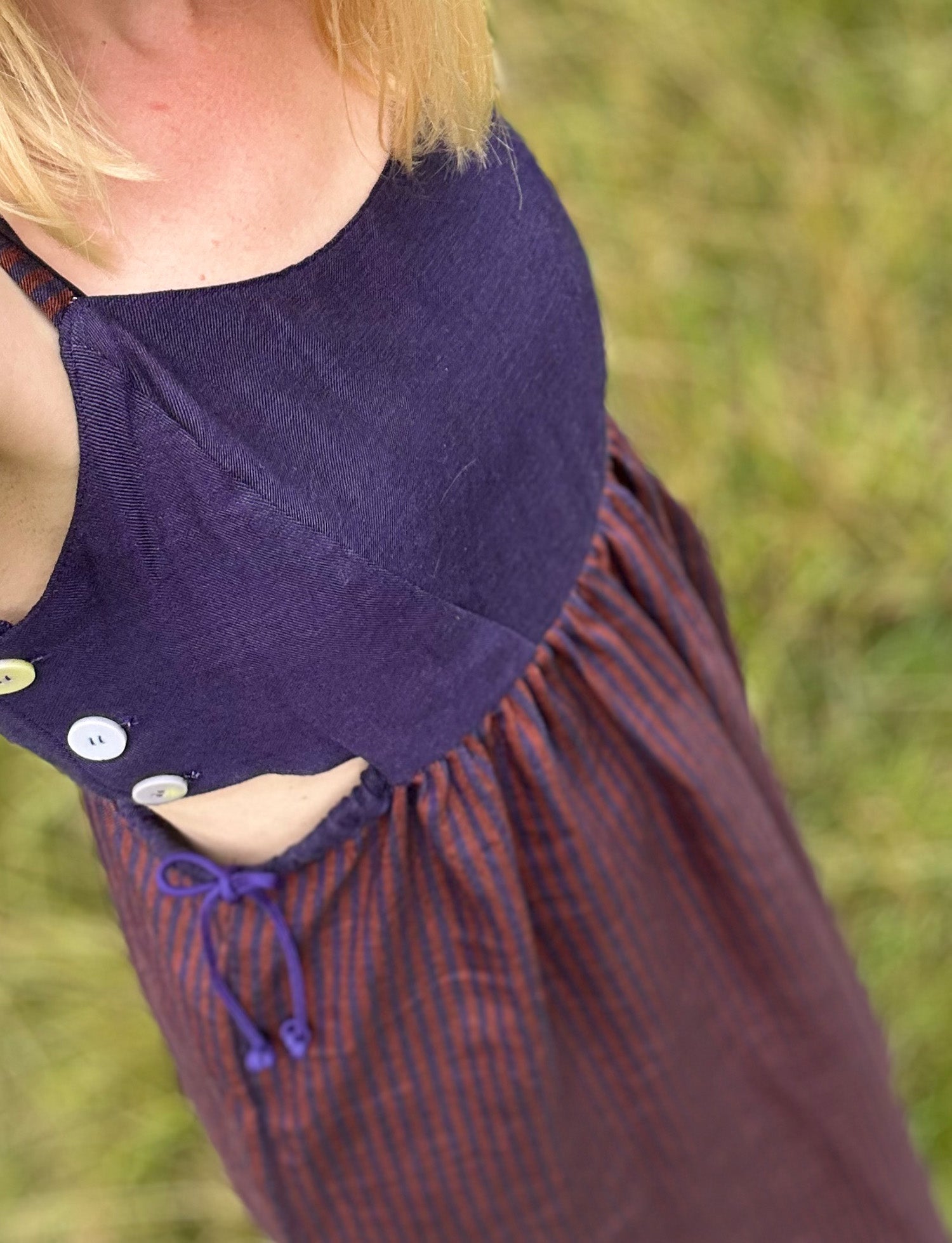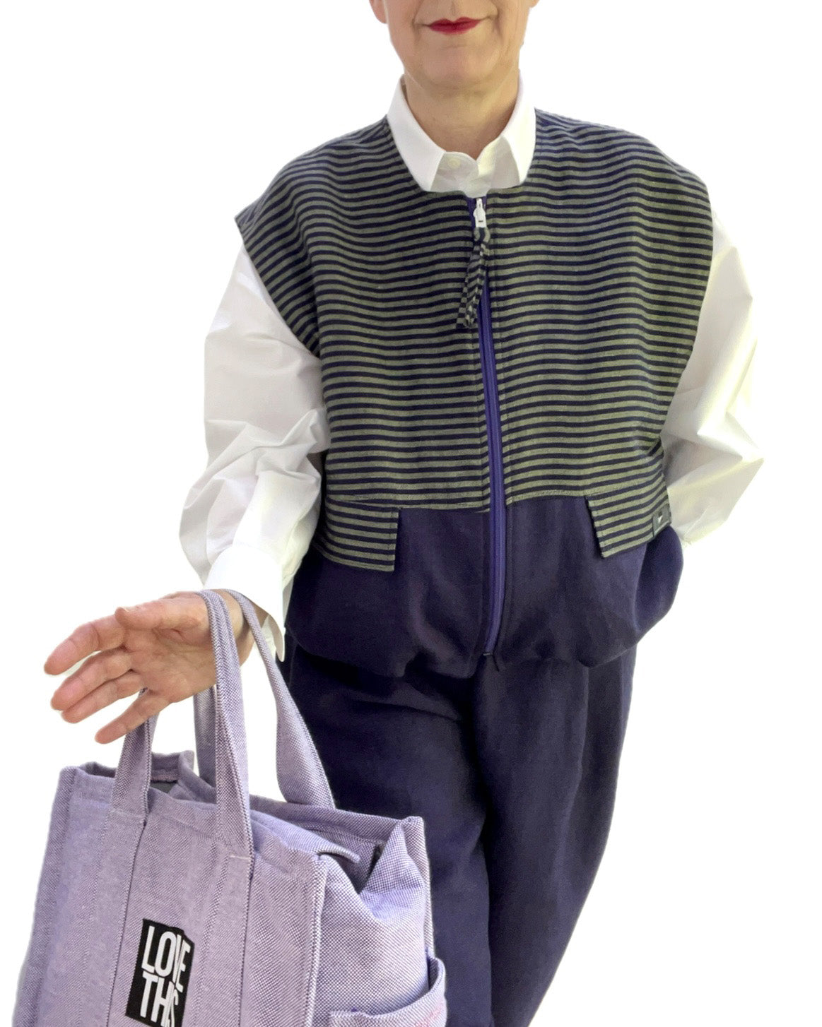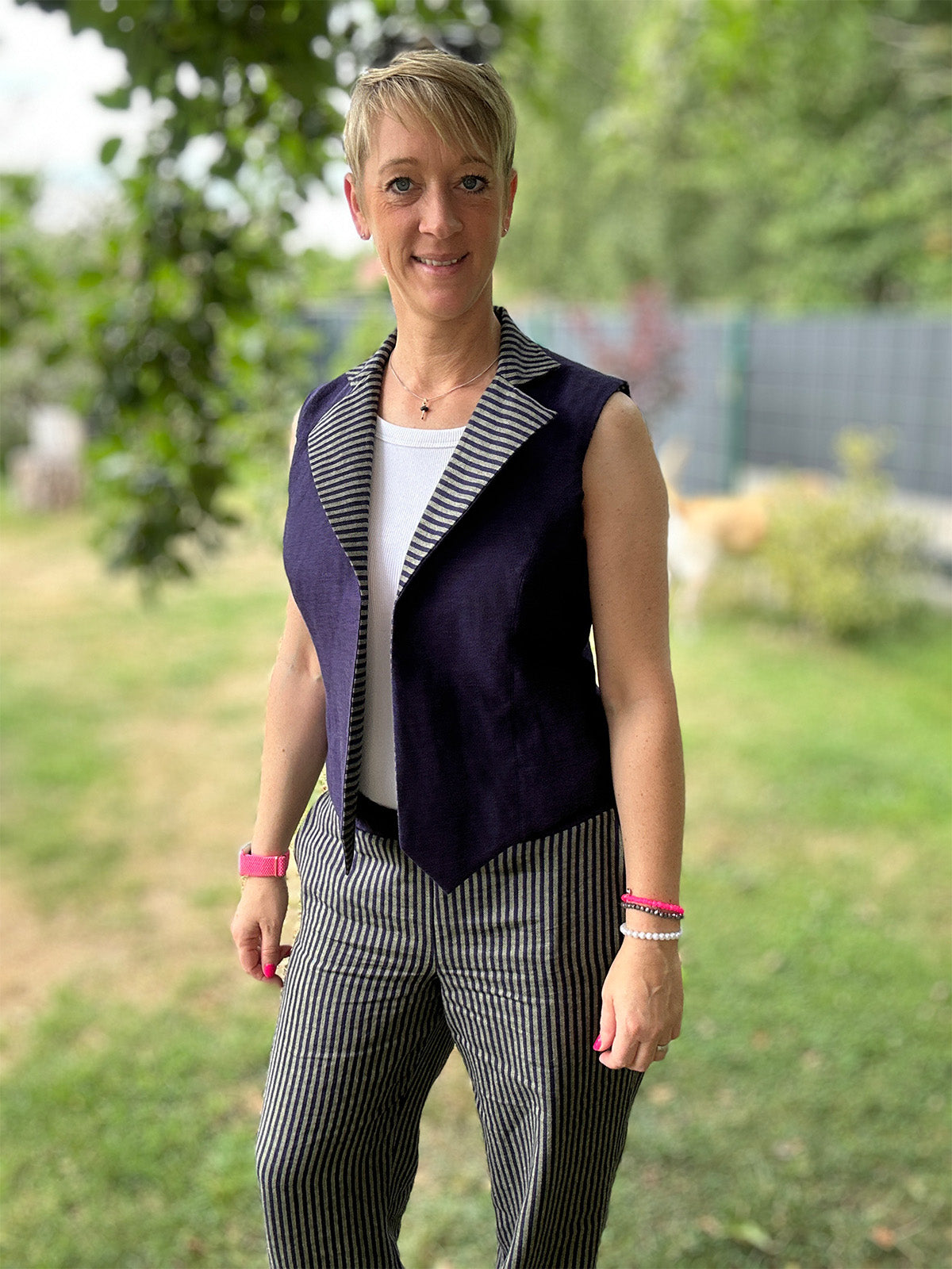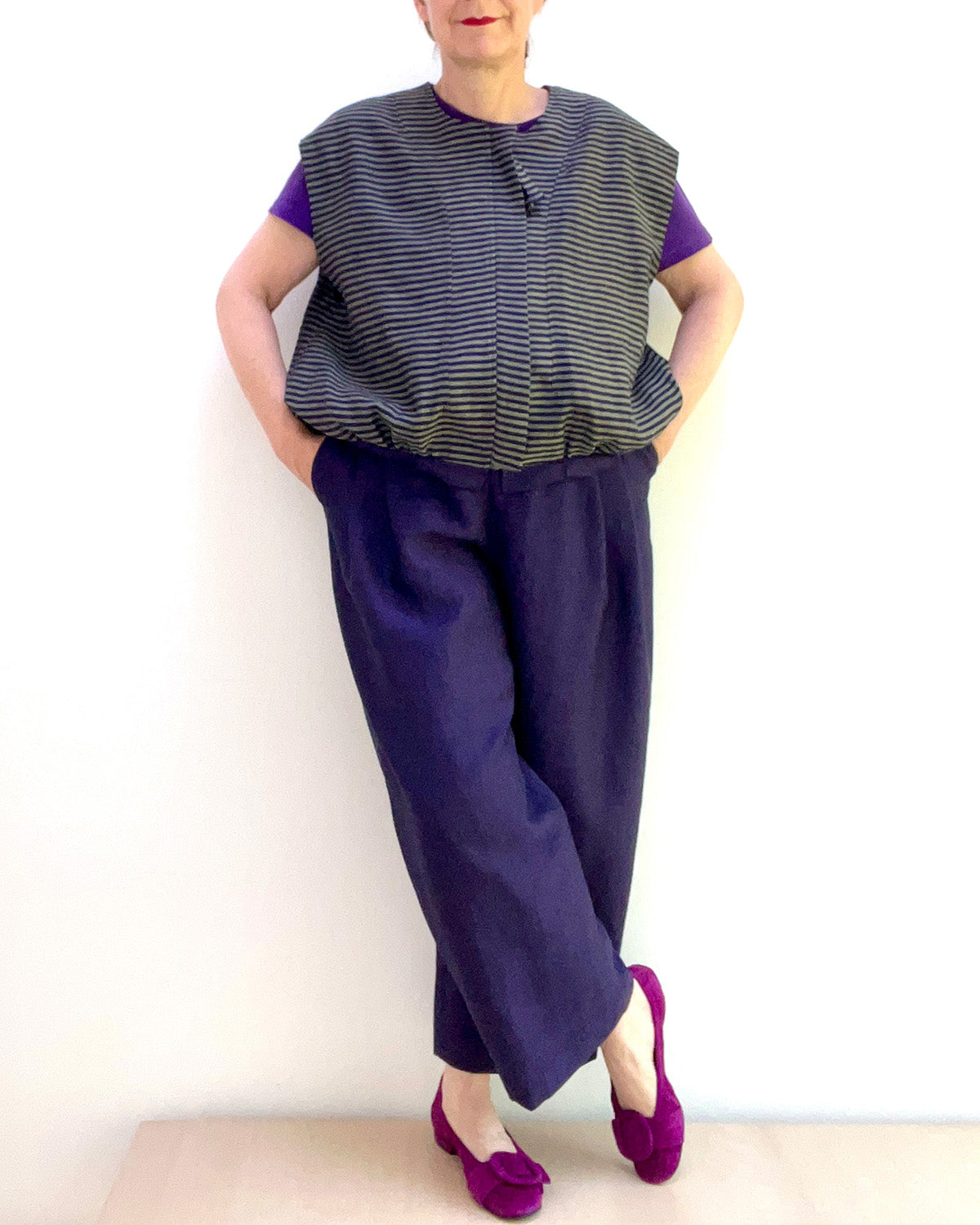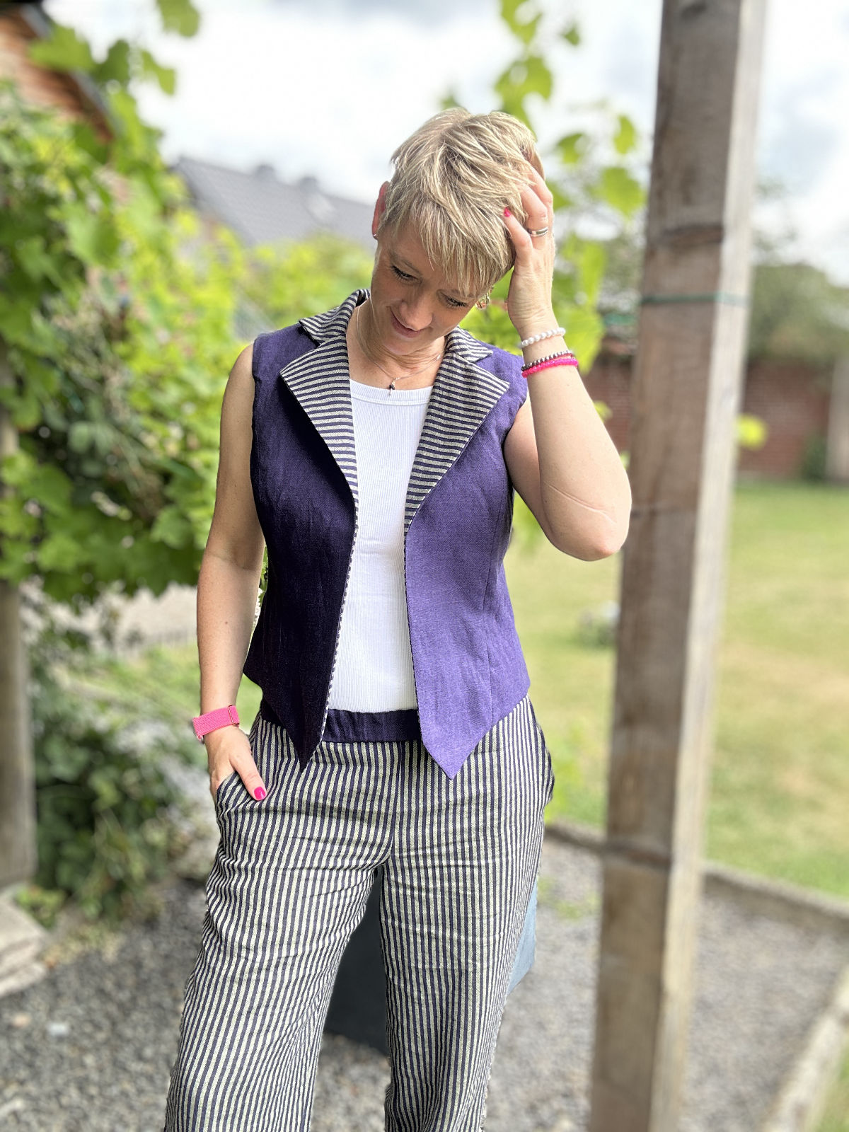 Nina von fashion-diy.de hat sich für eine Schnittkombination aus ihrem eigenen Sortiment entschieden! Ihre weite Hose und ihre Weste zum Wenden in der Farbvariante Lila/Lindgrün ergeben ein trendiges Outfit.