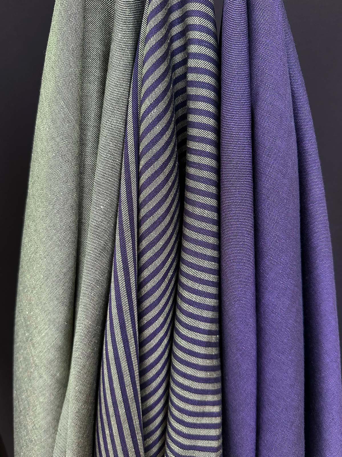 Dieser Wolle-Leinen-Mix kommt als Uni in kühlen Lindgrün zu dir unter die Nähmaschine und lässt sich wundervoll kombinieren mit dem Streifen in Lila/Lindgrün!