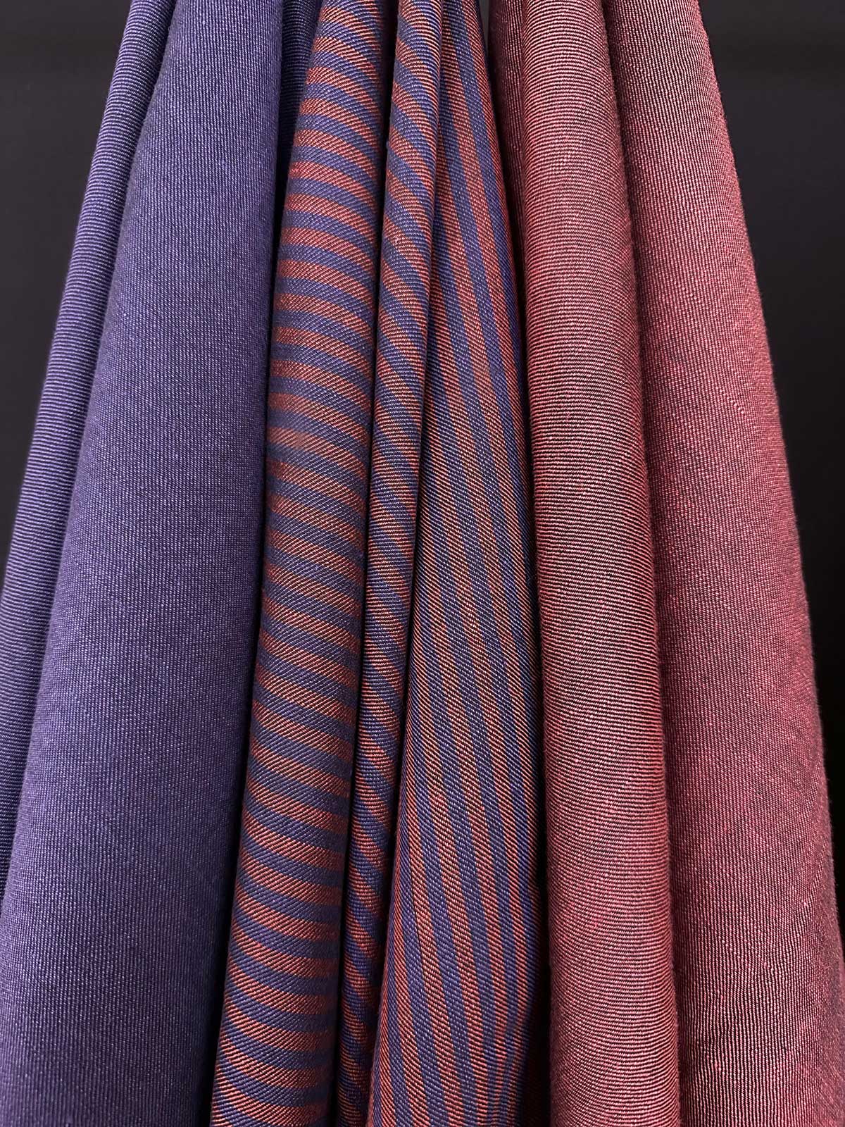 Dieser Wolle-Leinen-Mix kommt als Uni in warmen Rot zu dir unter die Nähmaschine und lässt sich wundervoll kombinieren mit dem Streifen in Lila/Rot!