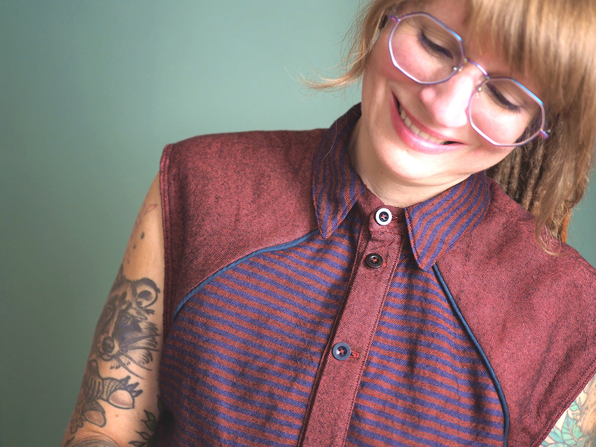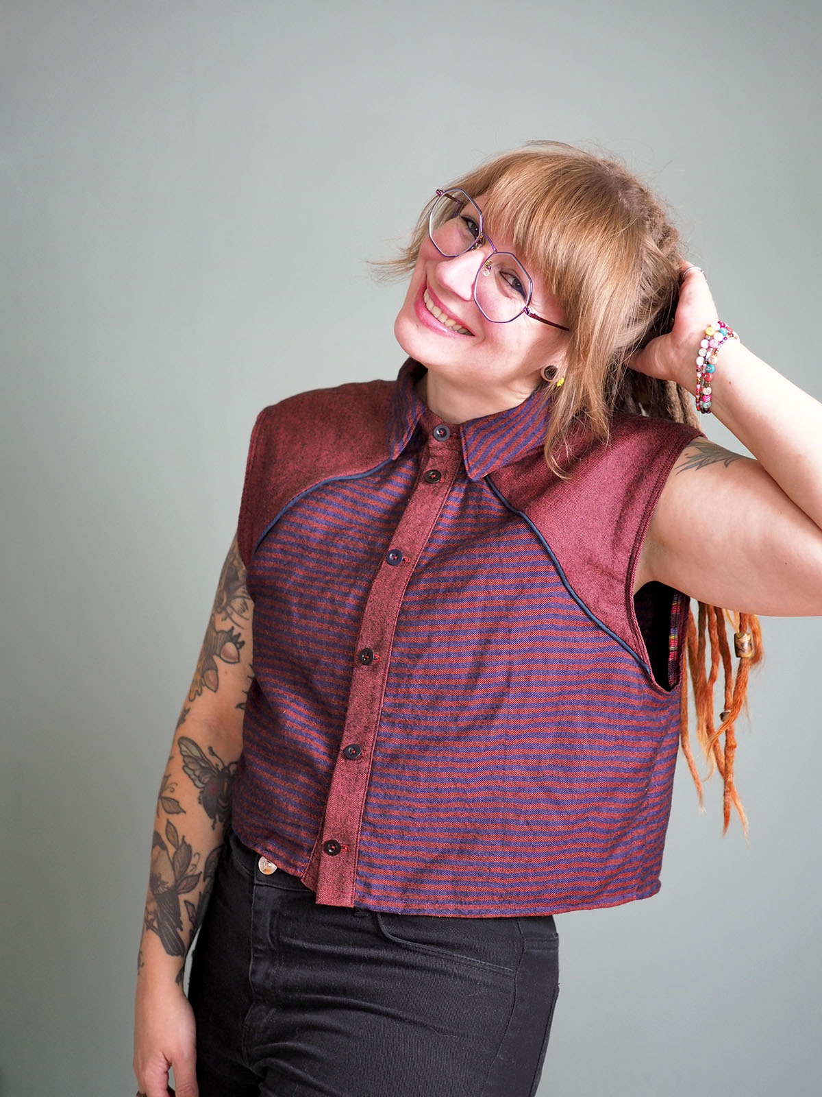 Wuselgewusel vereint in ihrem Blusentop 'Maren' aus dem Berninamagazin 'Inspiration' den Wolle-Leinen-Streifen in der Farbe Rot/Lila mit dem Uni in Rot!