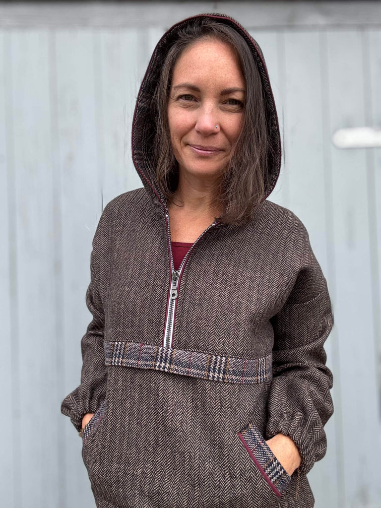 Der Hoodie ist für unsere Webware entstanden und wurde kombiniert mit dem Glencheck Erich. Das Schnittmuster gibt es leider noch nicht. Es wird aber so schnell wie möglich bei Katjuschka erscheinen und wir halten euch hier auf dem Laufenden! Mehr zur Nähanleitung erfährst Du auf dem Blog!