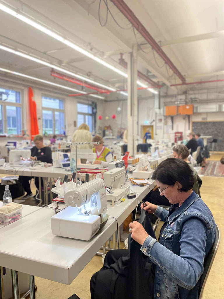 We provide a spacious sewing area for your machines in our cozy event hall, and you can, of course, use our professional ironing station . Our sewing guide, Ines, will be on hand to offer expert tips and tricks, and if you need more fabric, you can, of course, shop exclusively at Zuleeg's fabric warehouse with professional advice .