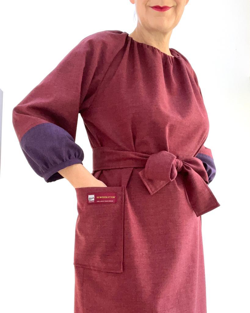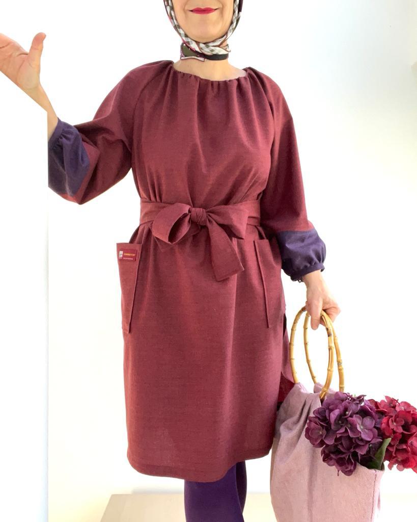 @unasewing2021 pimped up the RIKA pattern from @Fibremood a bit with color blocking! She added the lower part of the sleeve in our WASHWOOL in GRAPE, and the rest of the dress was made in POMEGRANATE.
