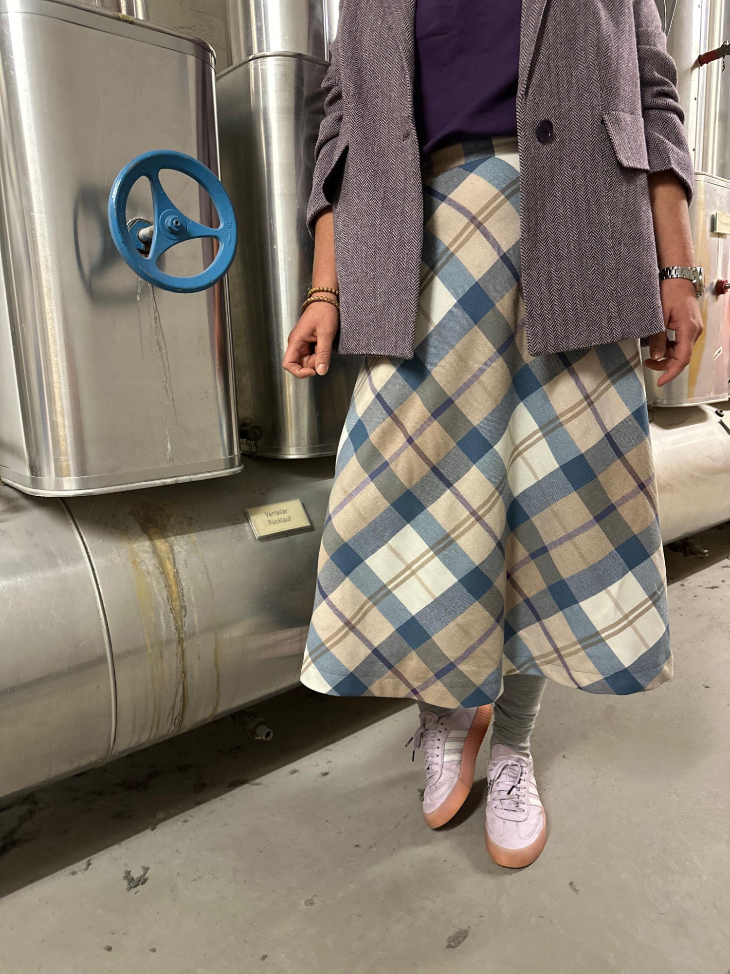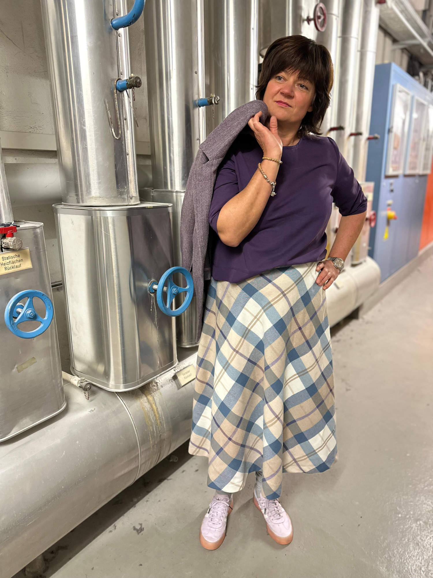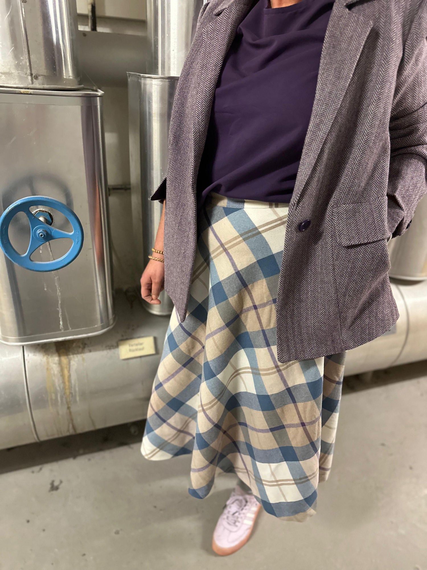 Steffi hat sich von Anfang an in das Maxikaro mit dezenter Farbkombination aus Beige, Rauchblau und Lila verliebt und es in einen coolen Statementrock nach dem Schnittmuster #120 aus der Burda 09/24 verwandelt und kombiniert dazu ganz stilsicher ihren lässigen #talblazer aus unserem einzigartigen German Tweed Dornröschen.