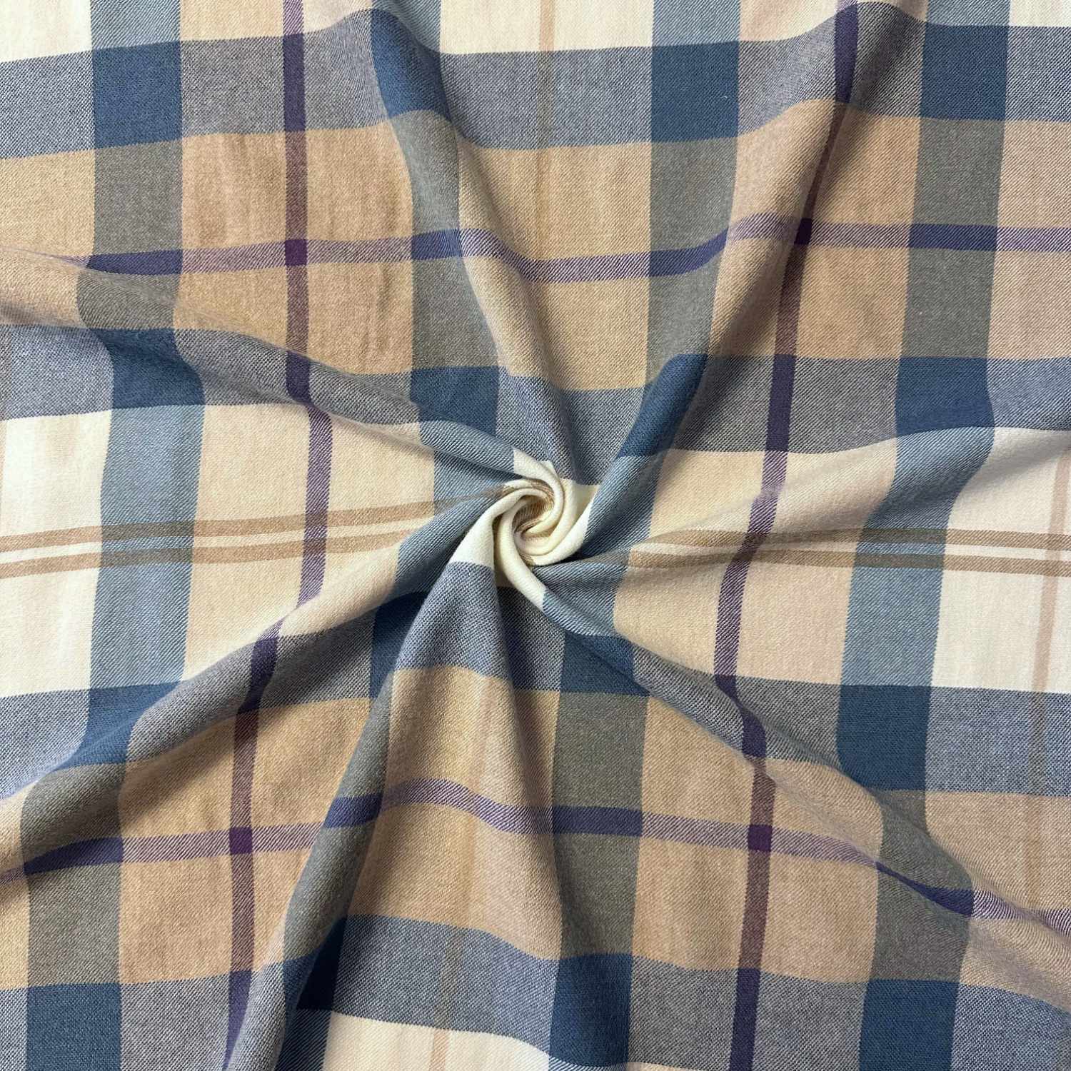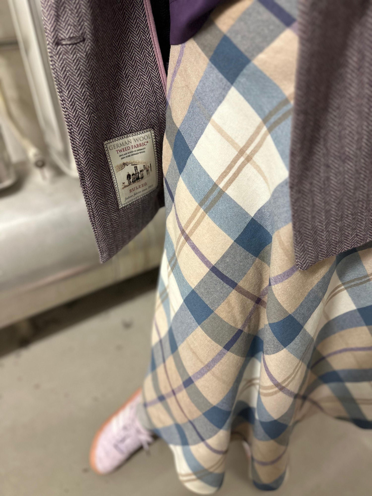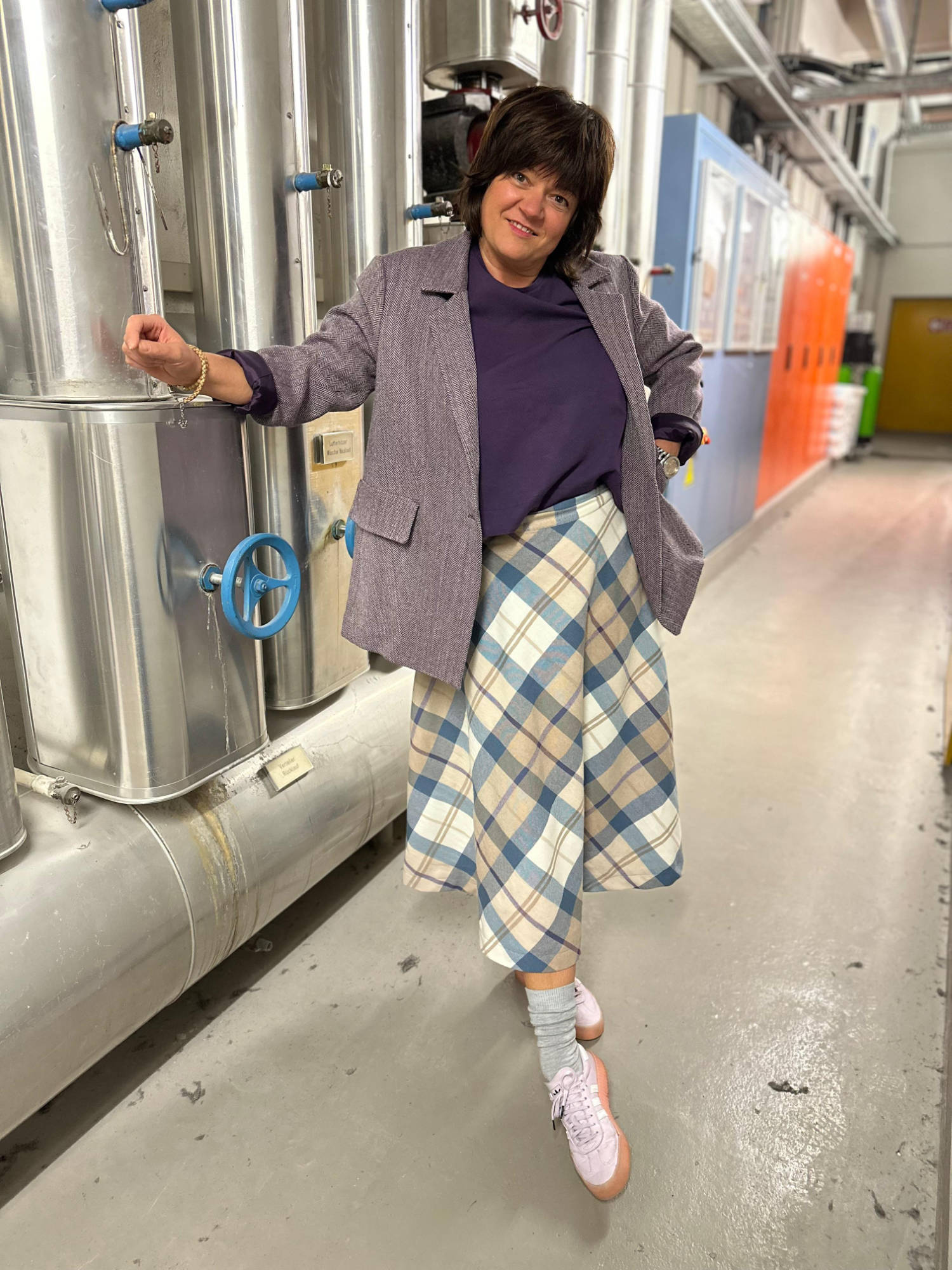 Steffi hat sich von Anfang an in das Maxikaro mit dezenter Farbkombination aus Beige, Rauchblau und Lila verliebt und es in einen coolen Statementrock nach dem Schnittmuster #120 aus der Burda 09/24 verwandelt und kombiniert dazu ganz stilsicher ihren lässigen #talblazer aus unserem einzigartigen German Tweed Dornröschen.