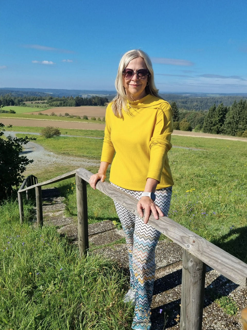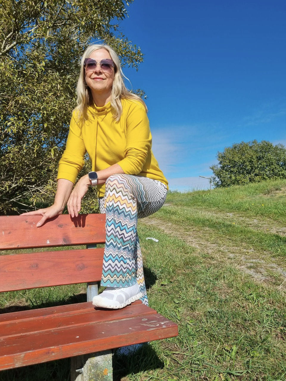 Michaela präsentiert einen lässigen Pullover in Kombination mit dem NXTMerino- Print "Miss Wave" als Hose.