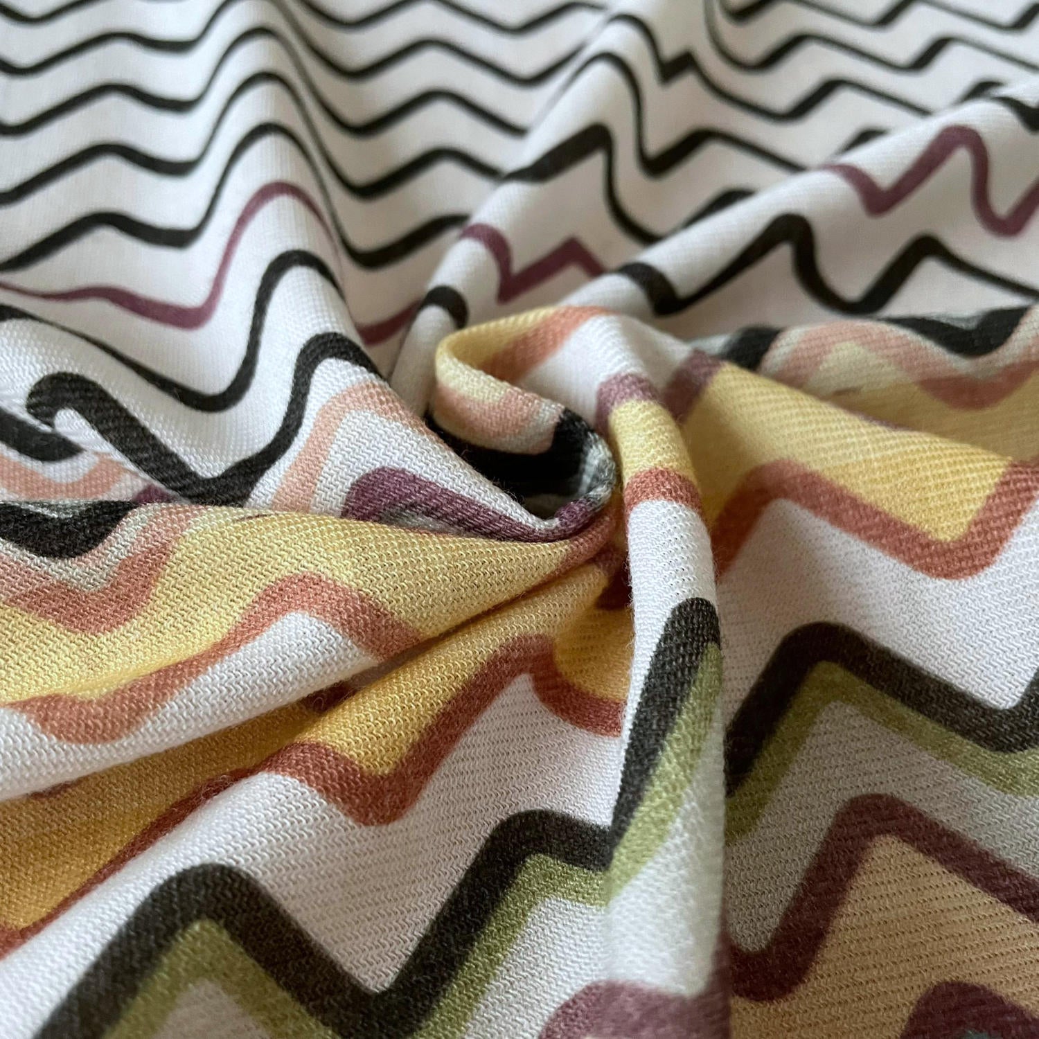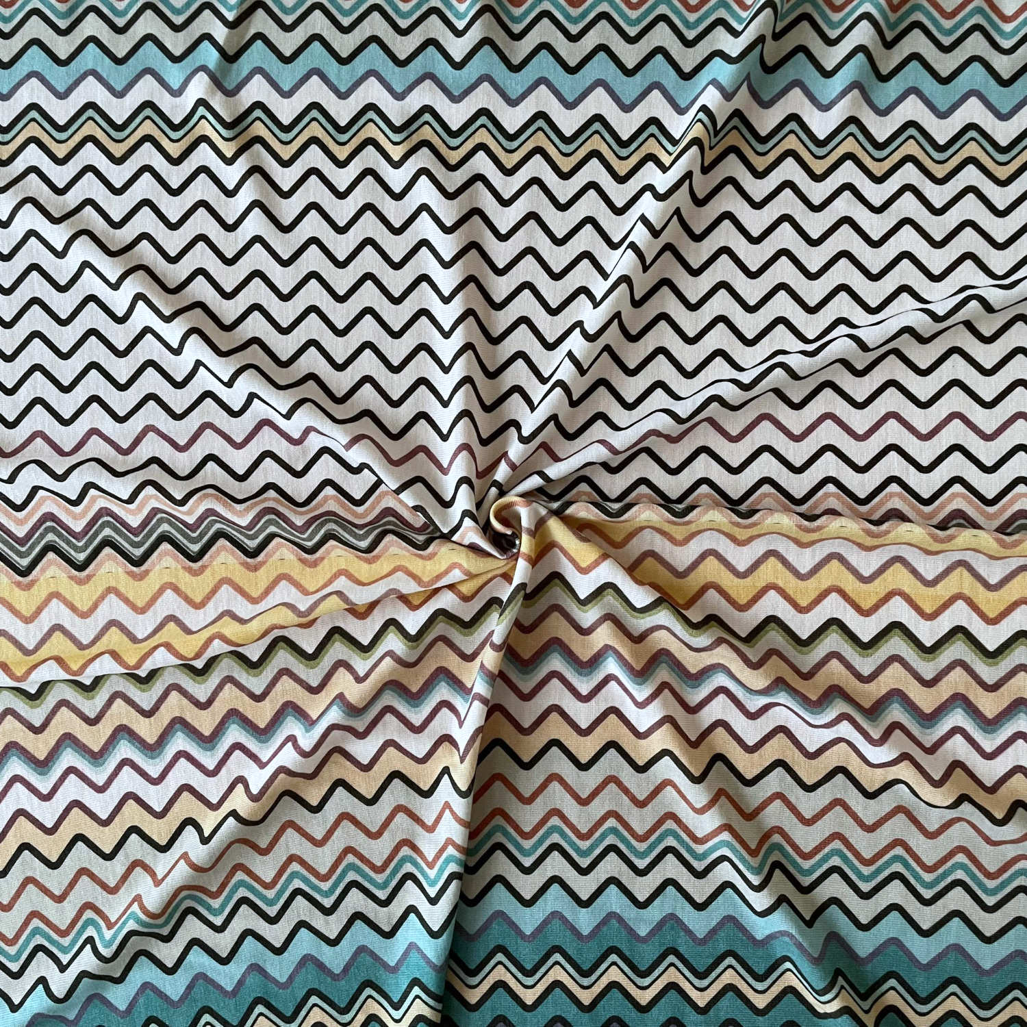 Bei der Farbe MISS WAVE handelt es sich um einen Print mit Zickzack-Design. Die Farben Blau, Türkis, Gelb und Beige ergeben einen dezenten Farbverlauf.