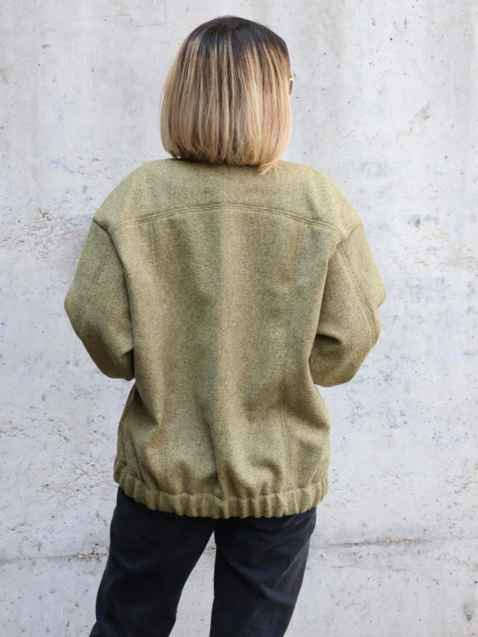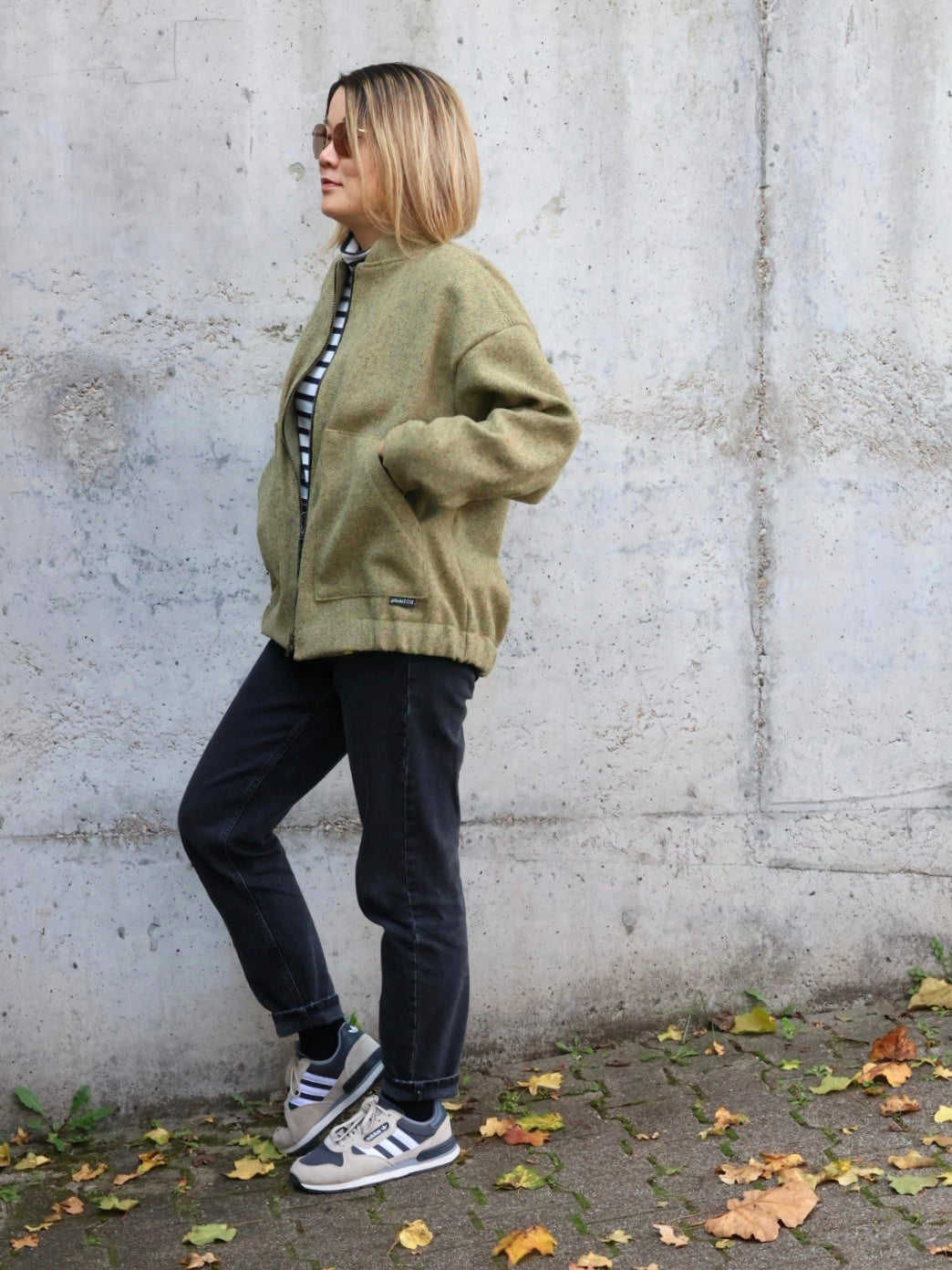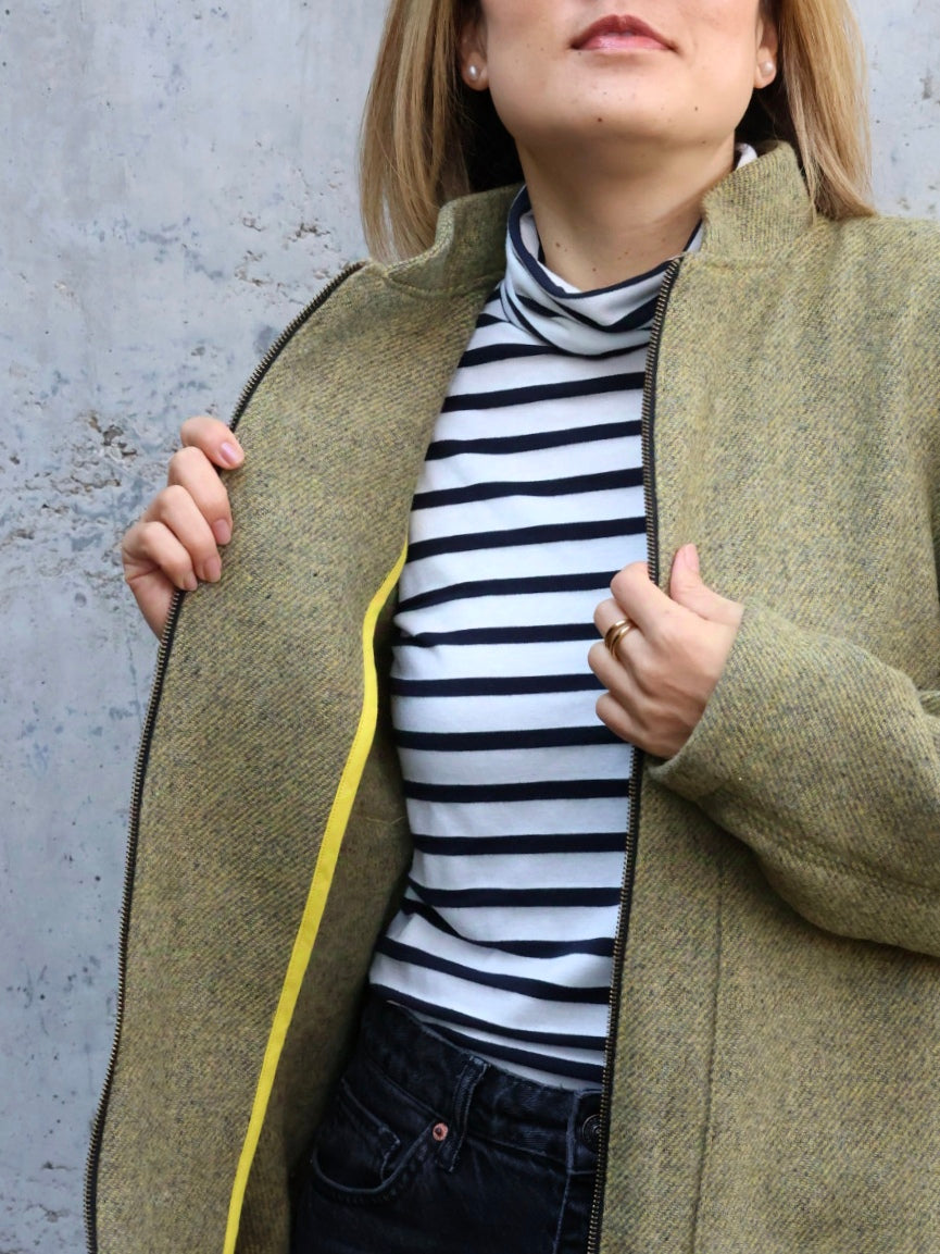 @gelbes_glueck hat unsere recycelte Wolle in der Farbe Senfgelb zu einer Jacke Tom von @sewingmachina vernäht und präsentiert damit den geschmeidigen und leichten Fall dieser gefälligen Wollqualität!